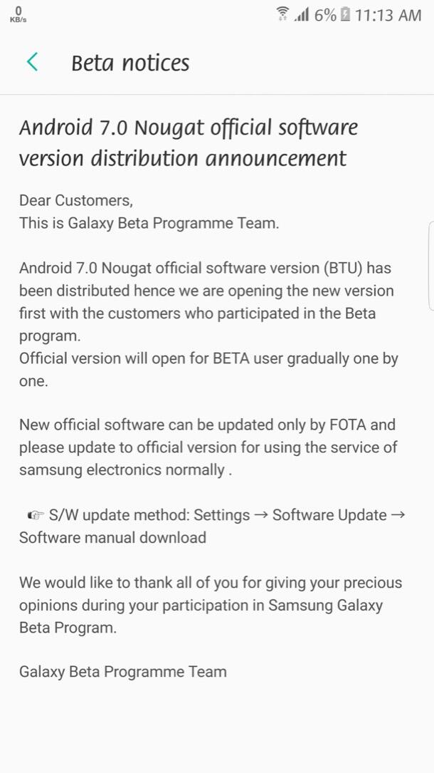 Das Samsung Galaxy S7 und das Galaxy S7 Edge bekommen das Update auf Android 7.0 Nougat. Wie üblich läuft die Verteilung dabei stufenweise ab. Ab sofort sind die Nutzer des Beta-Programs an der Reihe, die von Samsung über das finale Update (siehe Screen) informiert wurden. Sie können das über 200 MB große Update bereits laden. Kurz darauf sollten dann auch die freien Samsung Galaxy S7 (Edge) beliefert werden.