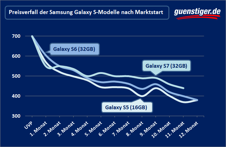 Methode: guenstiger.de untersuchte die Preisentwicklung des Samsung Galaxy S5, S6 und S7 in der geringsten Speicherausführung nach ihrem Marktstart. Dabei wurde der jeweilige Einführungspreis der Geräte mit dem preiswertesten Händlerangebot auf guenstiger.de ein bis zwölf Monate nach dem Marktstart verglichen.