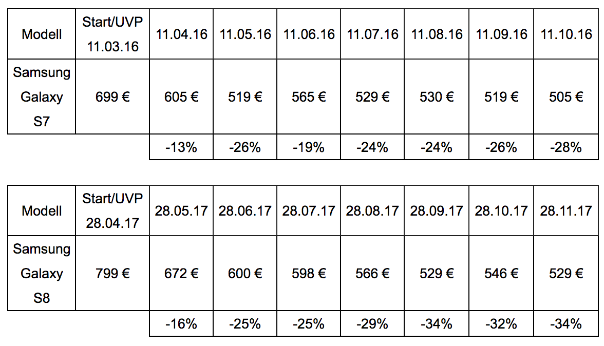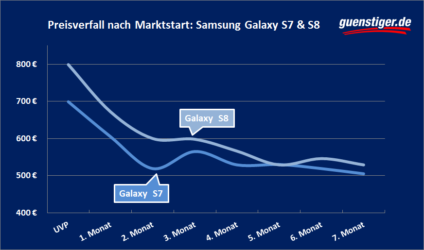 Methode: guenstiger.de untersuchte die Preisentwicklung des Samsung Galaxy S7 und S8 nach deren Marktstart. Dabei wurde der jeweilige Einführungspreis der Geräte (UVP) mit dem preiswertesten Händlerangebot auf guenstiger.de ein bis sieben Monate nach dem Marktstart verglichen.
