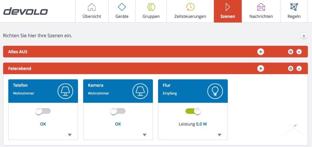 Zuerst müsst ihr, falls noch nicht geschehen, unter der Devolo-Oberfläche eure Szenen erstellen.