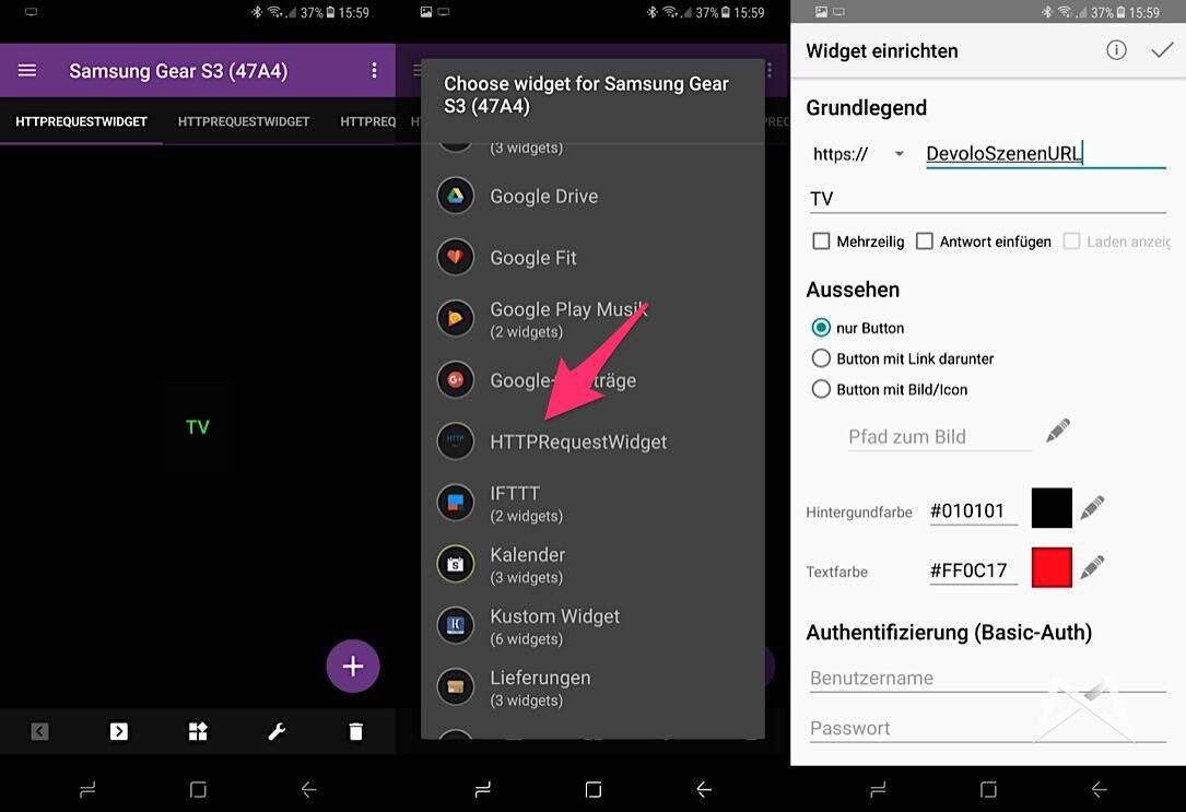 Dennoch gibt es Workarounds, um das eine oder andere Problemchen zu meistern. In einer ersten Suche konnte ich weder für IFTTT noch die Logitech Harmony Fernbedienung noch die Devolo Heimsteuerung irgendwelche Apps für die Smartwatch finden. Wohl aber die App WearableWidgets und das HTTPRequestWidget für Android. Diese beiden genügen, um meine Devolo-Szenen (Funksteckdosen in meinem Fall) zu steuern.