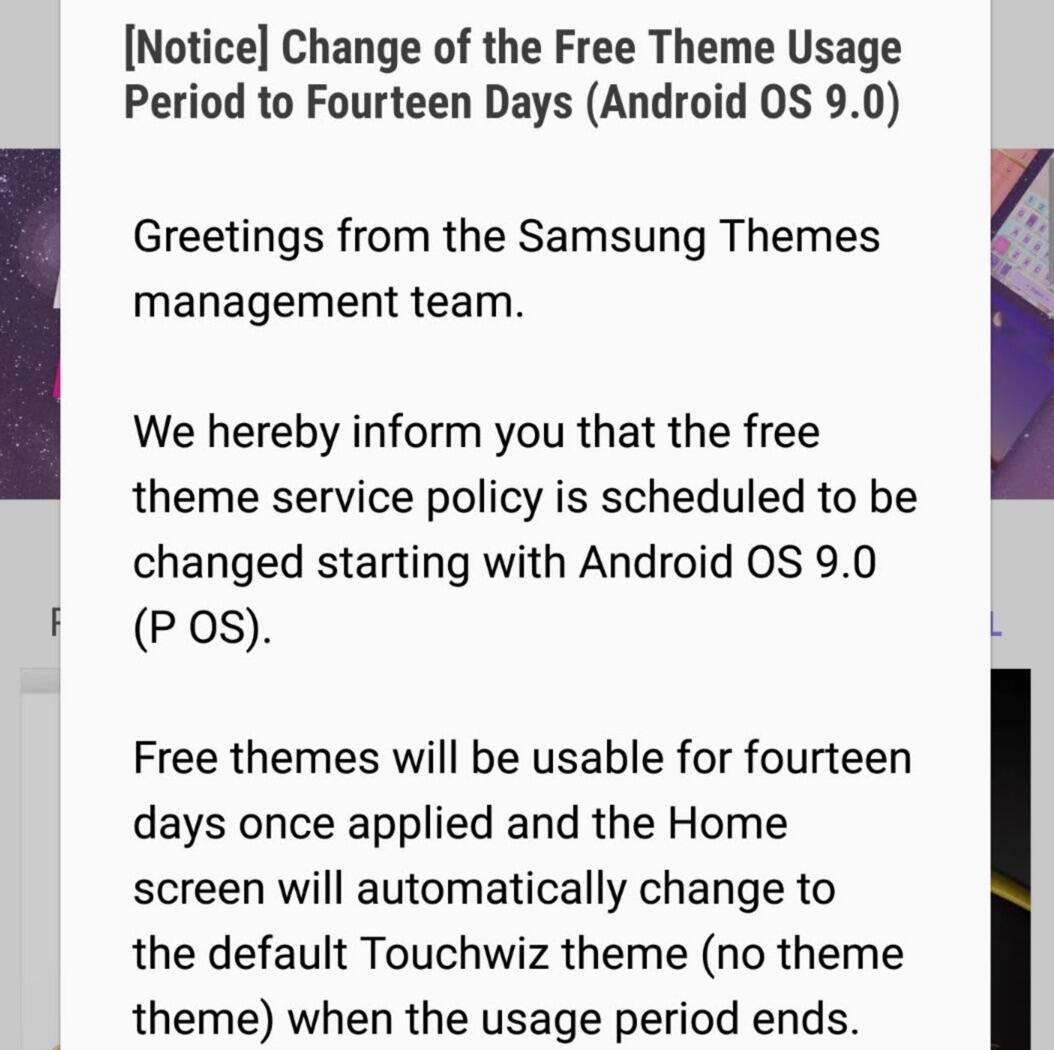 Bei kostenlosen Themes scheint die Nutzungsdauer in Zukunft auf 14 Tage festgelegt worden zu sein. Diese Änderung soll mit Android 9 Pie in Kraft treten. Nach zwei Wochen wird zum Standard-Theme von Samsung gewechselt, es gibt aber vorher noch zwei Hinweise: 1 Tag vorher und 10 Minuten vorher.