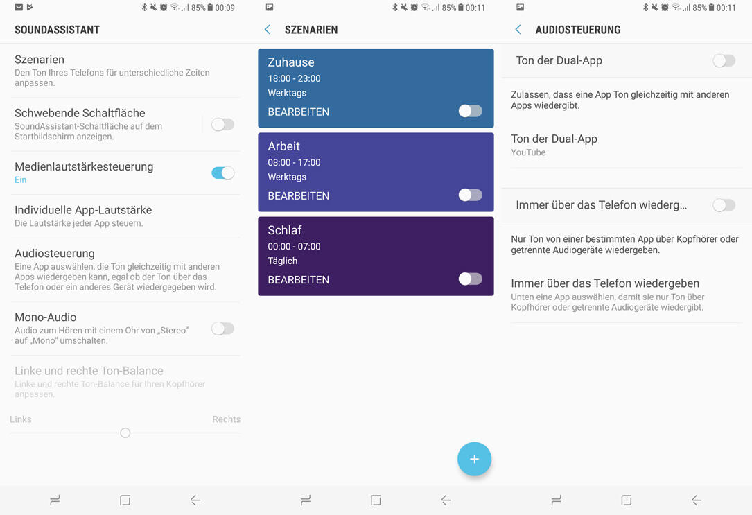 Es gibt die Möglichkeit Sound-Profile nach Tageszeiten anzulegen, aber auch ein Feature namens „Dual-App“. Hiermit lässt sich eine App festlegen, die den Ton weiter abspielen darf, obwohl eigentlich eine andere App im Vordergrund ist. Nützlich ist auch die Option festzulegen, dass Musik z. B. über den Kopfhörer läuft und Musik von Spielen dazu über den integrierten Speaker abgespielt wird.