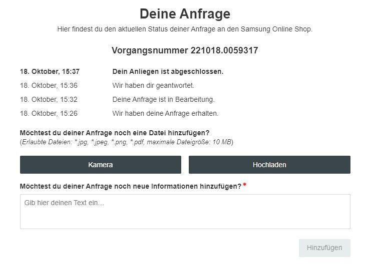 • Im Folgenden seht ihr einen Screenshot über eine Anfrage, welche ich zwischenzeitlich auch mal über ein Online-Formular an Samsungs Shop gerichtet hatte. Geht ratzfatz dieses Mal: