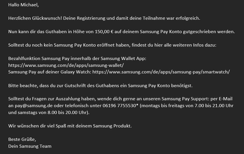 Ganz still und heimlich wurden meine 150,- EUR nun auf das bei der Registrierung angegebene Girokonto gutgeschrieben. Ich hätte es beinahe nicht bemerkt, weil ich eigentlich darauf gewartet hatte, dass das Guthaben auf SPAY (auf die Uhr) kommt, zumal ich selbiges seit der GW5 ja auch nutze. Naja. Vielen Dank Samsung. Nach nur 3 Monaten (!) ewigem hin- und her ist nun das Thema beendet. Ich hatte beinahe nicht mehr daran geglaubt.