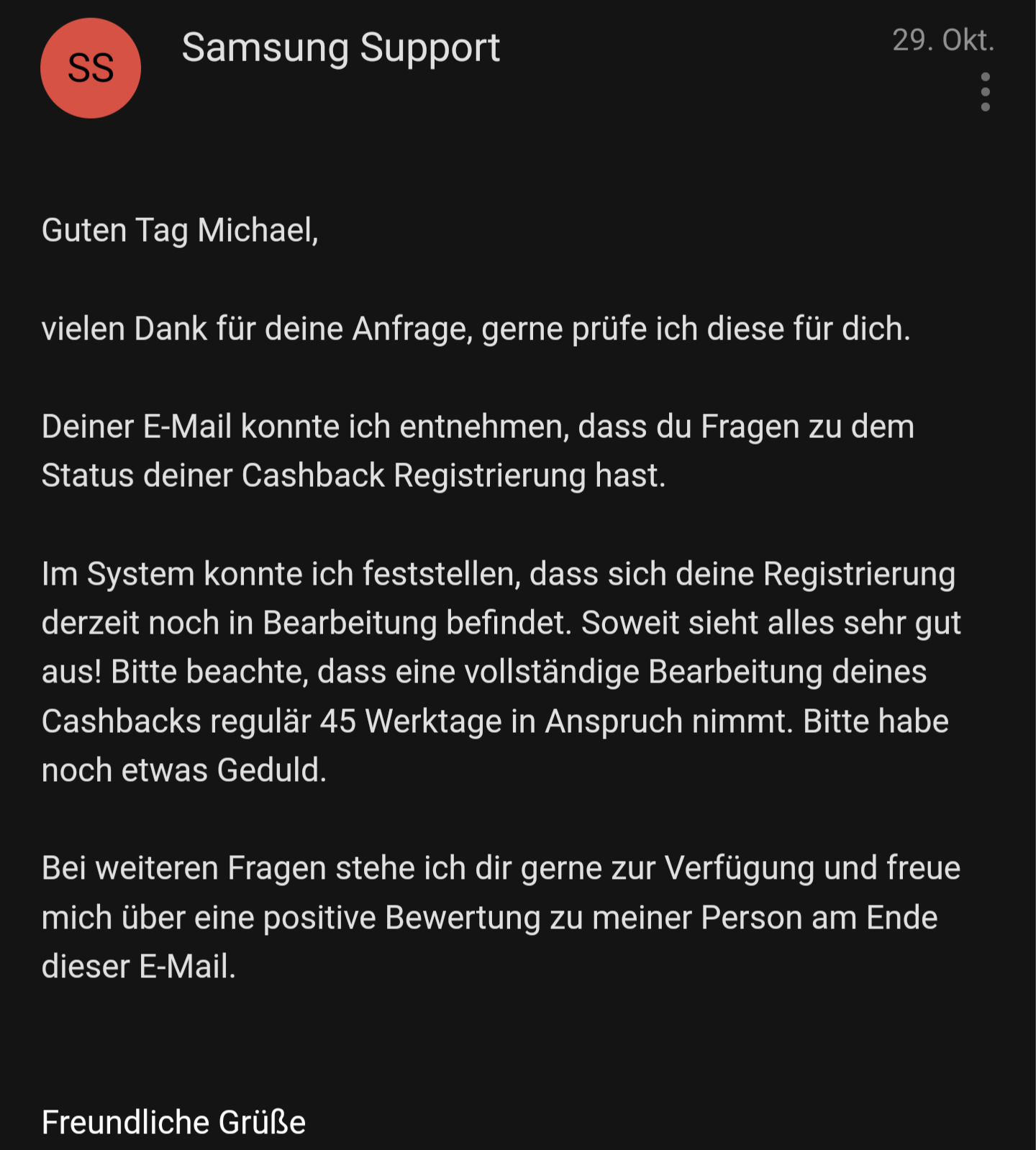 Am Ende einfach behauptet das das bestimmt in meiner Spam gelandet ist, da ich meine Spam jede Woche mehrfach checke und ich bereits Emailverkehr mit Markenmehrwert von Samsung hatte, kann ich das aber definitiv ausschließen.