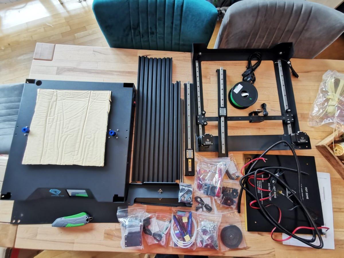 Da kann man eigentlich nicht viel falsch machen. Bedingt durch die Größe des Druckers im fertig zusammengebauten Zustand wird der Drucker aber fast komplett in Einzelteilen angeliefert und liegt nicht schon zumindest teilweise zusammengepackt im Karton.