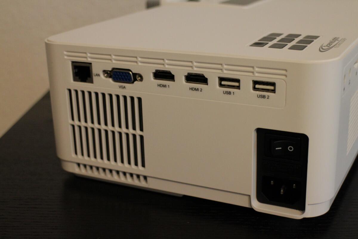 - Schnittstellen: 2x HDMI, 2x USB, AV-Eingang (3,5-mm-Klinke auf Audio- und Video-Cinch), VGA, Audio-Ausgang (3,5-mm-Klinke), SD-Karten-Steckplatz, IR-Empfänger, RJ-45 (LAN)