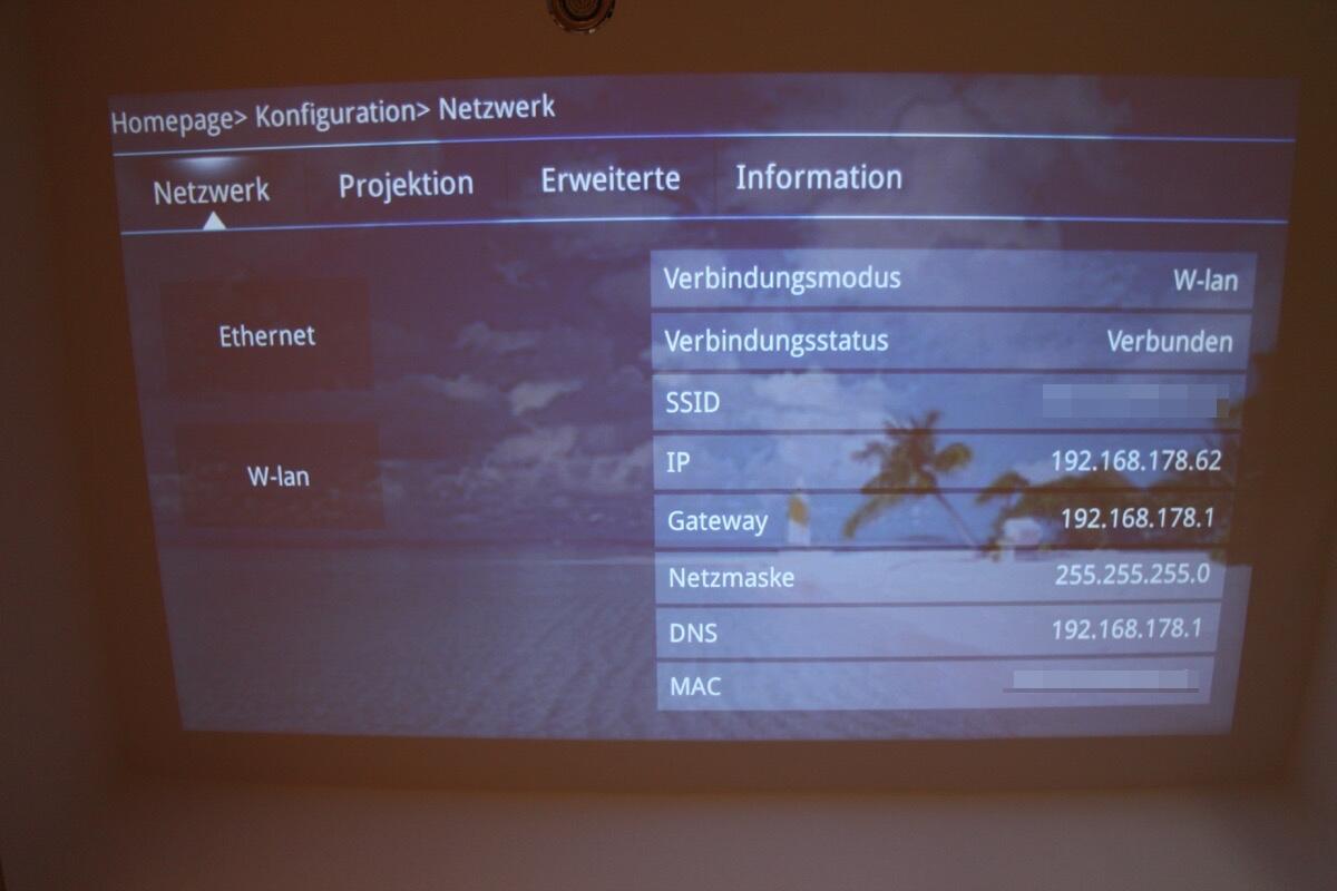 Ins WLAN-Netzwerk geht der LED-Beamer über den WLAN-Standard IEEE 802.11b/g/n (2,4 GHz only). Unterstützung für 5 GHz WLAN wäre hier zwar schön gewesen, in der Preisklasse hatte ich das aber nicht erwartet.