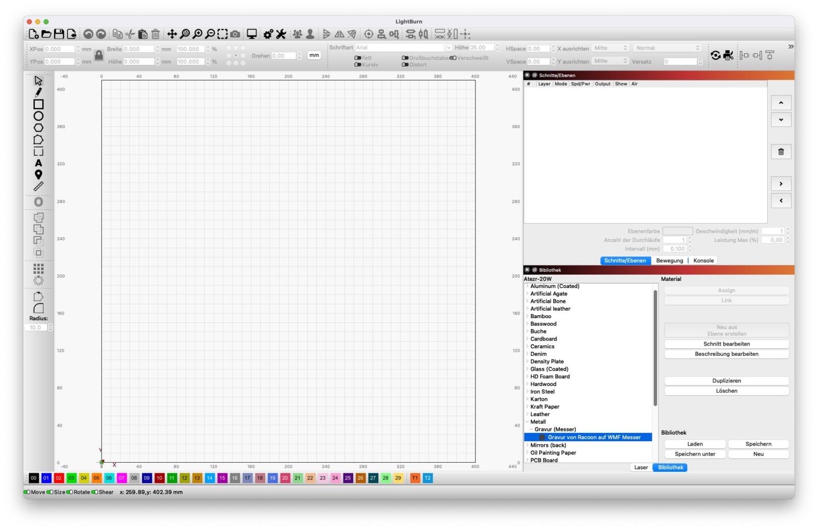 Es folgt ein heißer Tipp meinerseits! Checkt unbedingt beim Luisiana Hobby Guy im Forum vorbei. Dort gibt es auch so genannte Bibliotheken für Lightburn zu verschiedenen Lasern und ganz am Ende der Liste findet ihr dort auch einen ATEZR-20W, den ihr zumindest als grobe Richtung hernehmen könnt.
