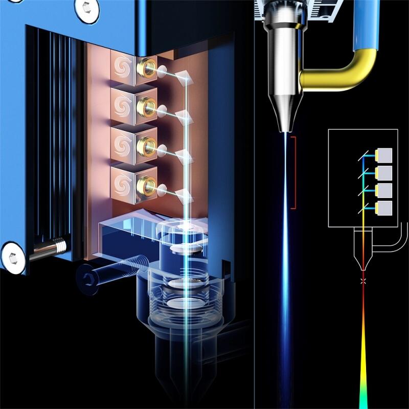 Kurz vorweg etwas dazu, wie die 20 Watt aktuell bei Dioden-Lasern erreicht werden. Im Grunde sind im inneren des nun deutlich größeren Laserkopfs nun insgesamt 4 Stück der 5,x Watt Laser eingebaut, deren Strahl dann zu einem gebündelt wird und damit dann die 20 Watt Power im Output erreicht.