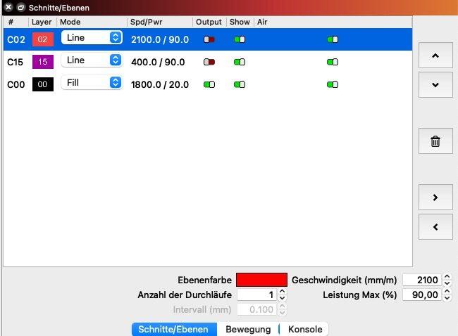 In Lightburn wird dann einfach rechts oben in dem Kästchen Schnitte/Ebenen auf dem jeweiligen Layer der mit/ohne AirAssistent gemacht werden soll der Haken bei Air aktiviert oder deaktiviert.