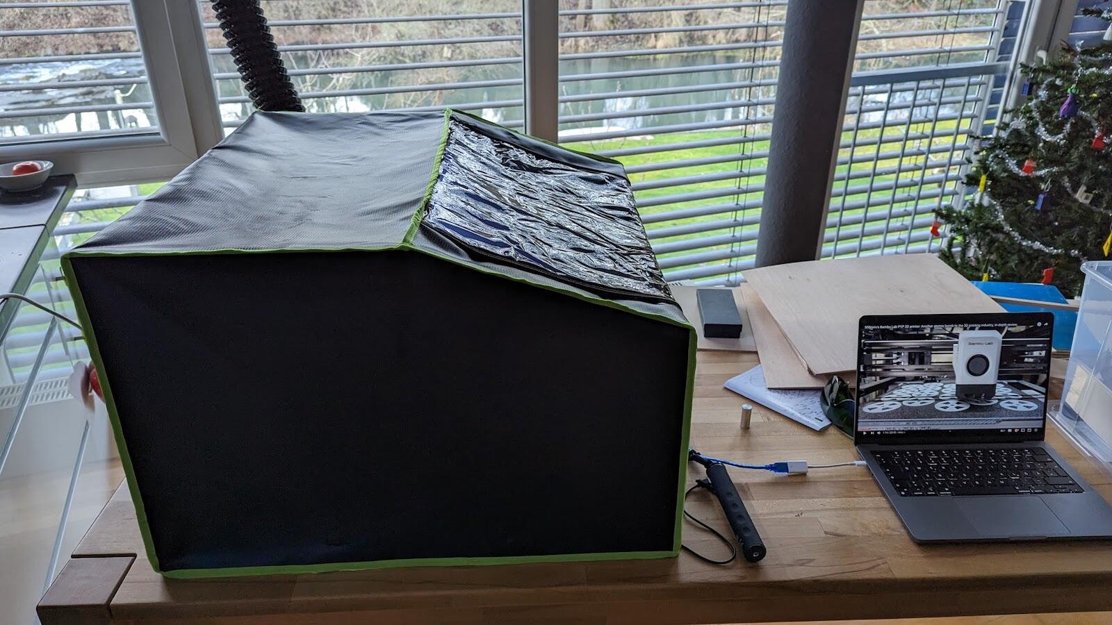 Ein Case inkl. Abluftschlauch und Ventilator kann generell auch nie schaden! Vom Snapmaker bin ich dieses System (in teuer aber dafür sehr gut verarbeitet) schon gewöhnt und zu der aktuellen Jahreszeit möchte ich nicht stundenlang auf der Terrasse mit dem Laser arbeiten. Eine kleine Recherche brachte mich dann zu dieser Lösung hier, die preislich im Rahmen war. Im Test stellte sich heraus, dass die Luft überraschend gut abgezogen wurde, die LED für tolles Licht im Case sorgte und man im Zimmer nur noch human den Geruch wahrnehmen konnte. Dabei soll das Material aber mehrere Minuten direktes Feuer aushalten und darum hatte ich dieses Case dann gekauft. Bitte nagelt mich nicht darauf fest – so etwas gibt es deutlich teurer auch aus anderen Materialien und hochwertiger verarbeitet. Für meine Hobby-Anwendung reicht es mir aber.