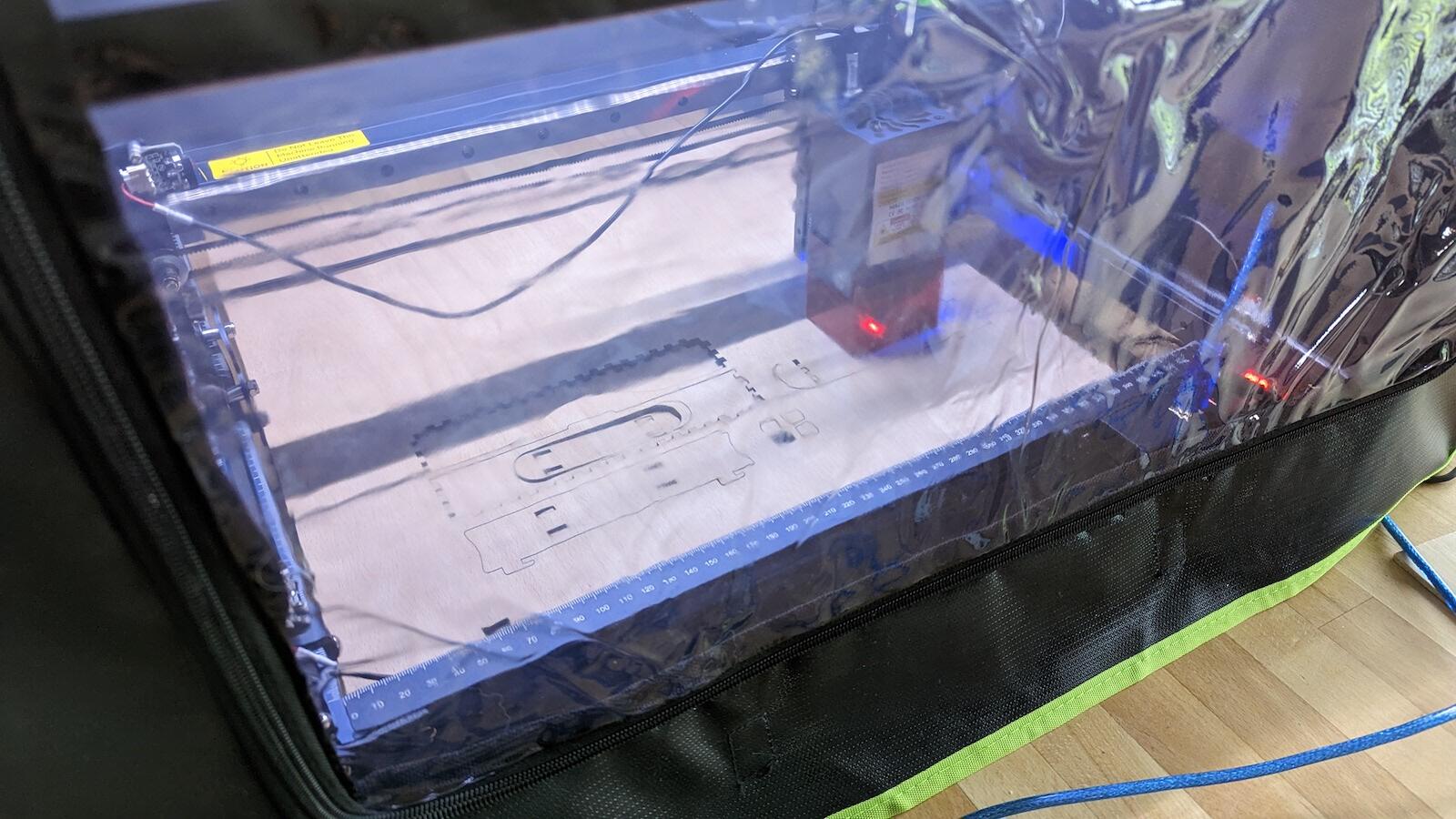 Nachdem das Case aufgebaut war (im Grunde wie eine Art Zelt mit Stangen und Plane, also auch gut wieder im Schrank verstaubar) konnte es weiter gehen. Ich habe für meine Schwester ein 12mm dickes Sperrholz aus dem Keller bearbeiten sollen. Material dürfte deutlich stabiler als Pappel sein, denn der Laser hatte damit durchaus zu schaffen. Der Einfachheit halber habe ich den AirAssist aktiviert, auf 200mm/m die Geschwindigkeit und auf 90 Prozent die Power gesetzt und einen Kreis fahren lassen. Das ganze dann auf 25 Wiederholungen gestellt und gewartet, bis der Kreisausschnitt durch das Loch gefallen war.