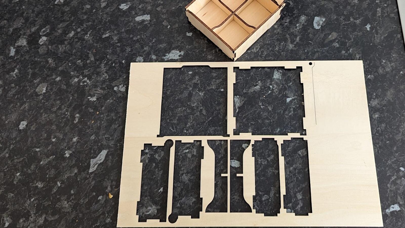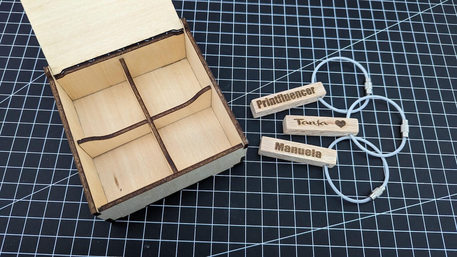 Auch ein Kästchen aus 4mm Pappel musste probiert werden. Bisher hatte ich für meine Arbeiten mit den vorhandenen Lasern immer 3mm Platten genommen, aber der 20W hat ja kein Problem mit 4mm und das Zeug gibt es im Bauhaus, wie auch bei Amazon und co. in diversen Größen. A4 oder A3 beispielsweise. Hier im lokalen Baumarkt waren die Platten sogar noch günstiger und man könnte auch kostenlos die perfekten Maße für die Wabenplatte oben direkt schon zusägen lassen.
