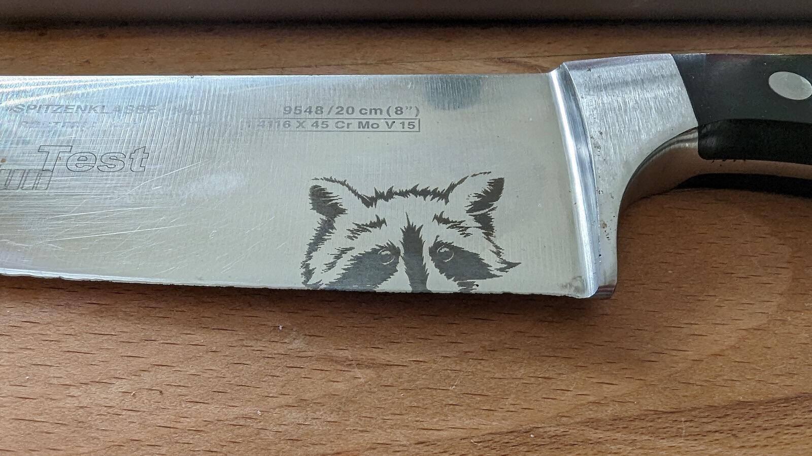 Jetzt geht es los! Kommen Sie näher, kommen Sie ran! Wir wagen uns an Metall! Natürlich kann der Laser kein Metall schneiden. Ok, gelogen. Er wird damit beworben, dass er Metall schneiden kann. Aber hierbei handelt es sich um hauchdünne Plättchen, die ich fast schon als Alufolie bezeichnen würde. Also vergesst es gleich wieder. ABER der 30 Pro Max mit seinen 20W kann Metall gravieren. Hierbei gibt es zwei Dinge zu beachten. Man benötigt keinen Kalkstift mehr zur vorherigen Behandlung der Oberfläche, damit der Strahl nicht abgelenkt wird und man kann je nach Geschwindigkeit und Power sogar verschiedene Farben in der Gravur erreichen! Letzteres habe ich nicht getestet, weil mir dazu das Metall fehlt, aber ich habe wieder mein gutes, altes, verranztes und abgegbrochenes WMF Küchenmesser hervorgezaubert und mit einem Racoon „bepinselt“!
