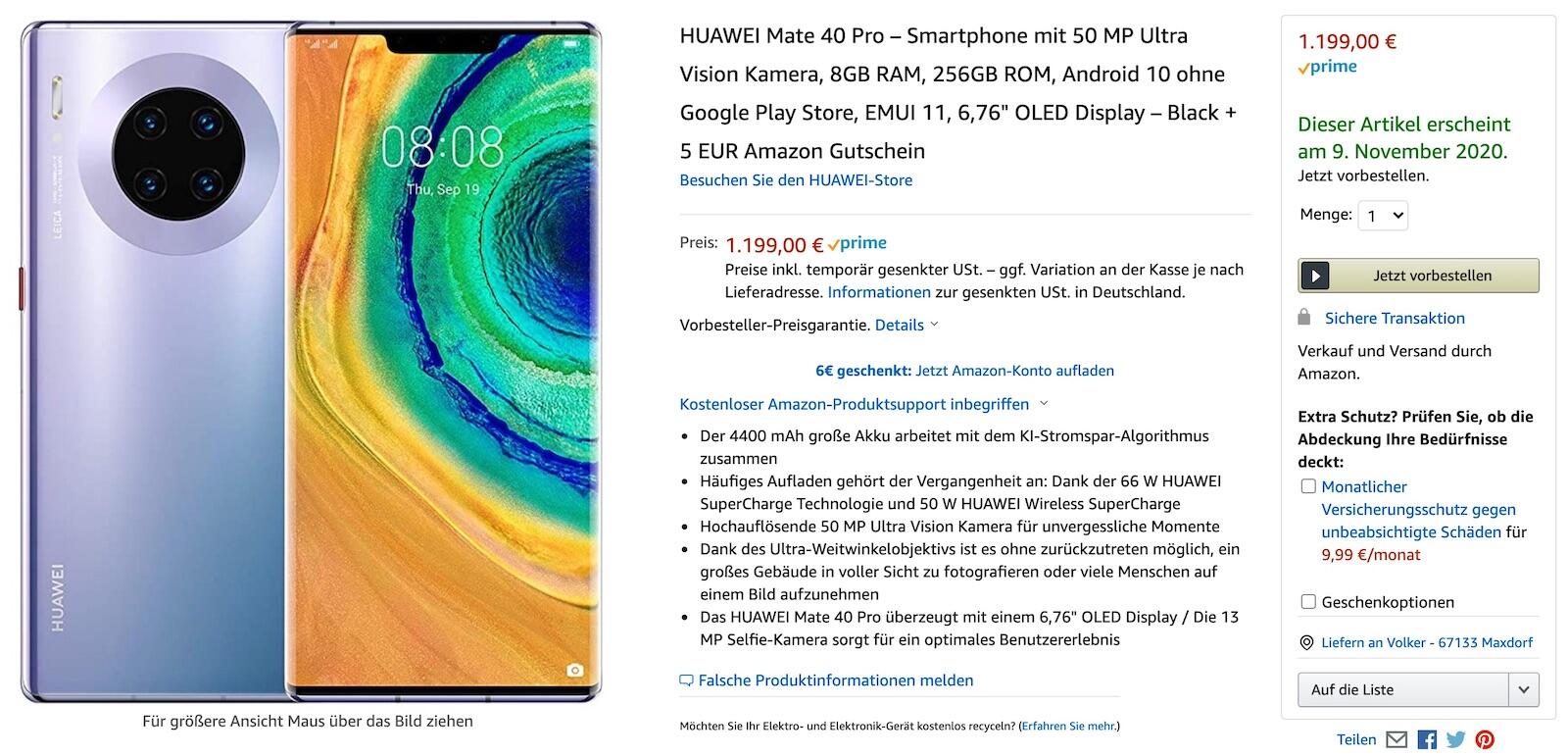 Huawei wird morgen das Mate 40 Pro (und weitere Modelle der Mate-Reihe) zeigen und ein Modell ist nun bereits bei Amazon aufgetaucht. Das Huawei Mate 40 Pro wird demnach 1199 Euro kosten und ab dem 9. November erhältlich sein.
