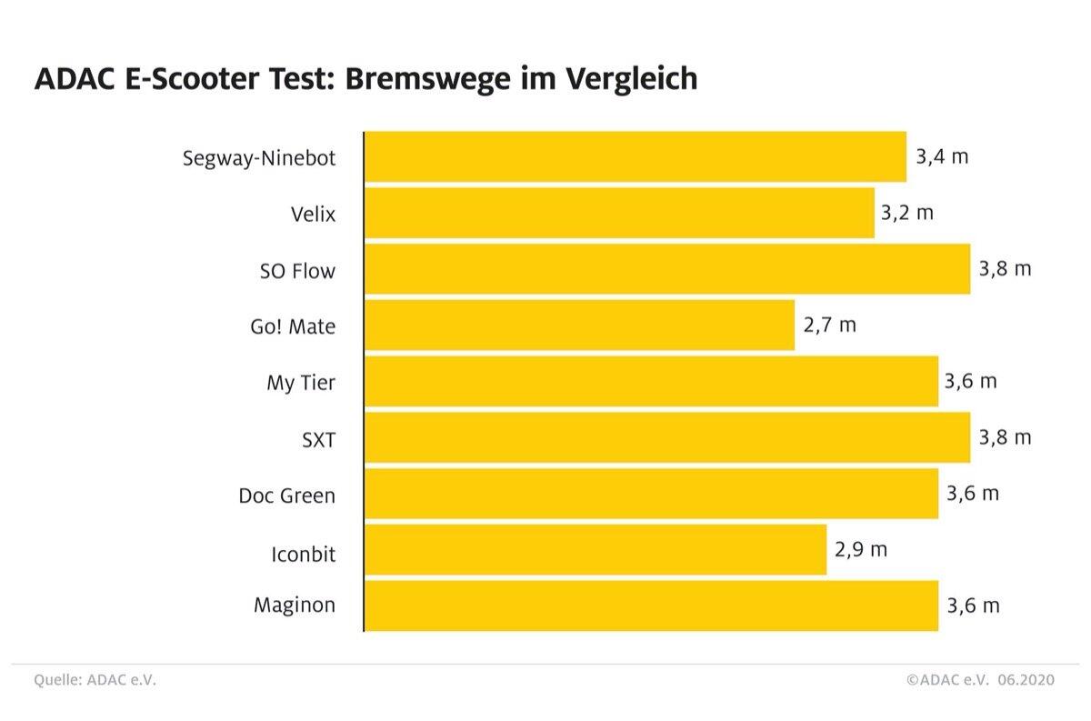 So registrierten die Tester des Clubs im Test aus dem vergangenen Jahr, bei dem das Preisniveau der elektrischen Tretroller noch deutlich höher lag, deutlich bessere und kürzere Bremswege. Die meisten Scooter kamen bei einer Geschwindigkeit von 20 km/h nach etwa zwei Metern zum Stehen.
