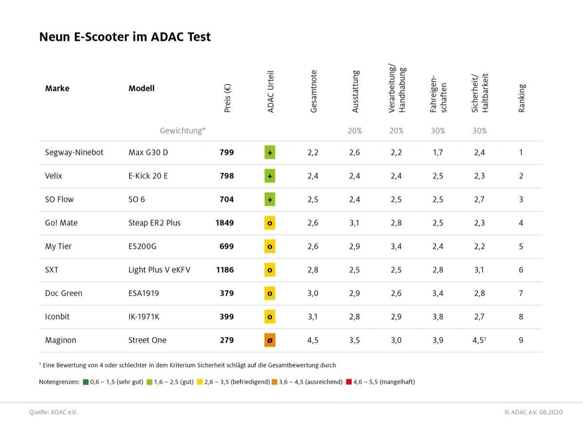 Testsieger mit der Note 2,2 ist ein E-Scooter aus dem mittleren Preissegment für rund 800 Euro: Der Segway-Ninebot überzeugte mit der besten Verarbeitung und den besten Fahreigenschaften, insbesondere durch seinen starken Antrieb und eine Reichweite von 46,2 km. Seine Größe, das vergleichsweise hohe Gewicht und die nur befriedigenden Bremseigenschaften verhindern insgesamt aber eine sehr gute Gesamtnote.