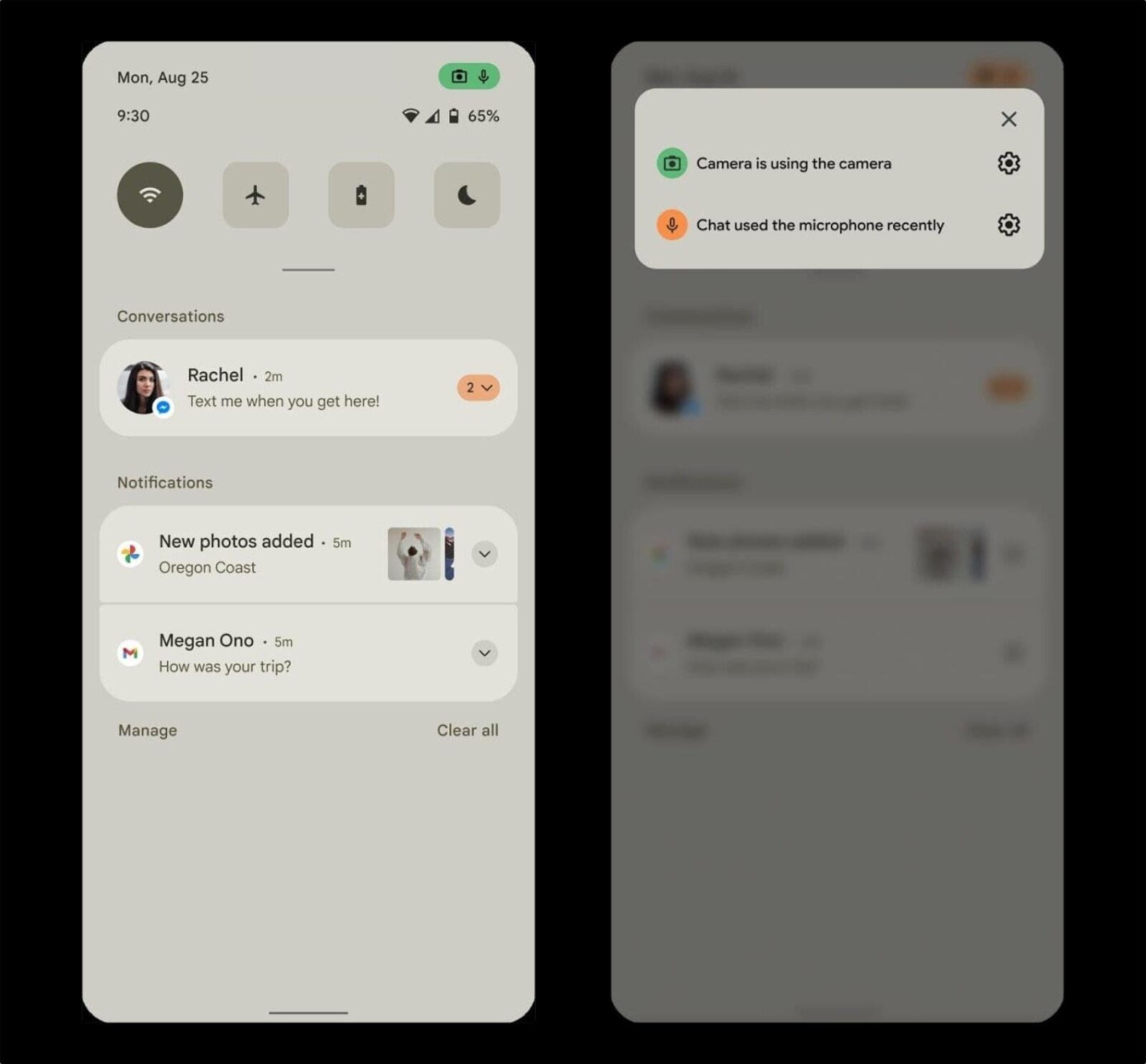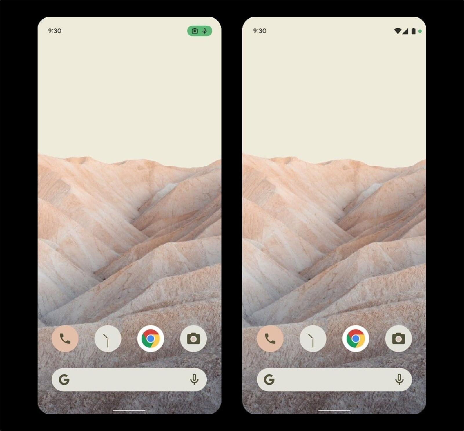 Google soll eine umfangreiche Theme-Funktion für Android 12 geplant haben und diese erkennt man hier bereits. Die ausgewählte Farbe zieht sich hier durch alle Screenshots. Auf einigen Screenshots sieht man auch einen Hinweis, dass die Kamera und das Mikrofon aktiv genutzt werden, das kennt man von iOS.