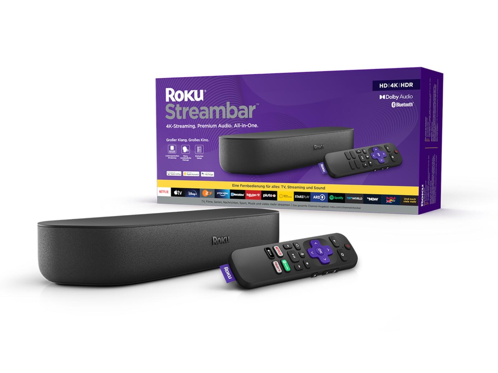 - Roku Streambar: Die Roku Streambar ist das ultimative 2-in-1-Entertainment-Upgrade mit leistungsstarkem Streaming und kinoreifem Sound für jeden Fernseher mit HDMI-Anschluss. Nutzer:innen hören jedes Detail und streamen auf kompatiblen TVs in lebendiger 4K-HDR-Bildqualität. Mit ihrem kompakten akustischen Design und der leistungsstarken Signalverarbeitung verfügt die Roku Streambar über vier 1,9-Zoll-Full-Range-Treiber mit sattem Dolby Audio. Dank der fortschrittlichen Audiotechnologie des Roku OS ist die Streambar intelligenter als andere Soundbars. Zwei Center-Treiber liefern ein klares, sauberes Klangbild, das Dialoge leichter verständlich macht, während die angewinkelten Seitentreiber den Raum mit Klang füllen. Die Einrichtung ist dank des im Lieferumfang enthalten Zubehörs sehr einfach. Dazu gehört eine Fernbedienung mit Sprachsteuerung, die die Stromversorgung des Fernsehers, den Ton und den Zugang zu einer Vielzahl von Streaming-Diensten steuert. Die Roku Streambar wird zu einem Preis von 149,99 Euro (UVP) erhältlich sein.