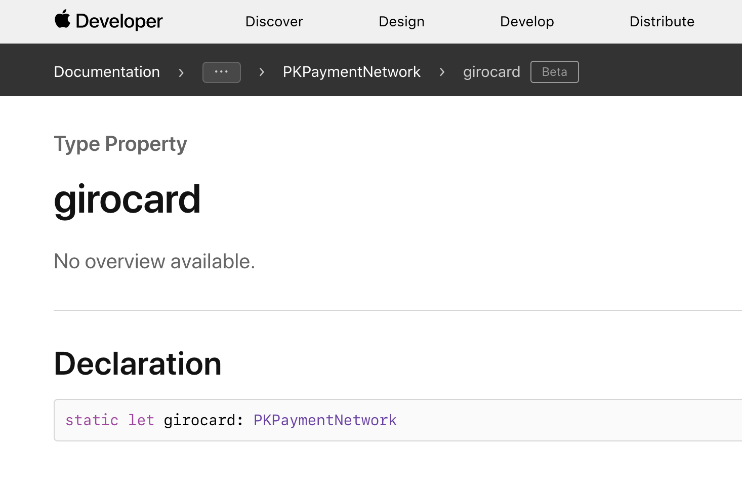 Apple Pay unterstützt verschiedene Bezahlverfahren bzw. Bezahlnetzwerke. Zukünftig wird dazu auch die girocard der „Deutschen Kreditwirtschaft“ gehören. Das bestätigt Apple auch selbst, denn man hat aktuell im Entwicklerportal den Eintrag „girocard“ mit Betastatus hinzugefügt.