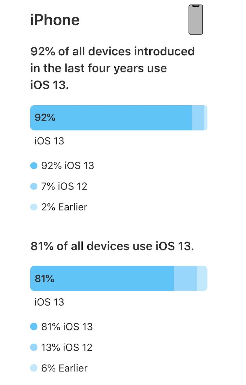 Die frischen Zahlen zeigen, dass iOS 13 von 81 Prozent aller iOS-Nutzer genutzt wird. Blickt man auf Modelle, die nicht älter als vier Jahre sind, dann kommt die aktuelle Version sogar auf einen Marktanteil von über 90 Prozent.