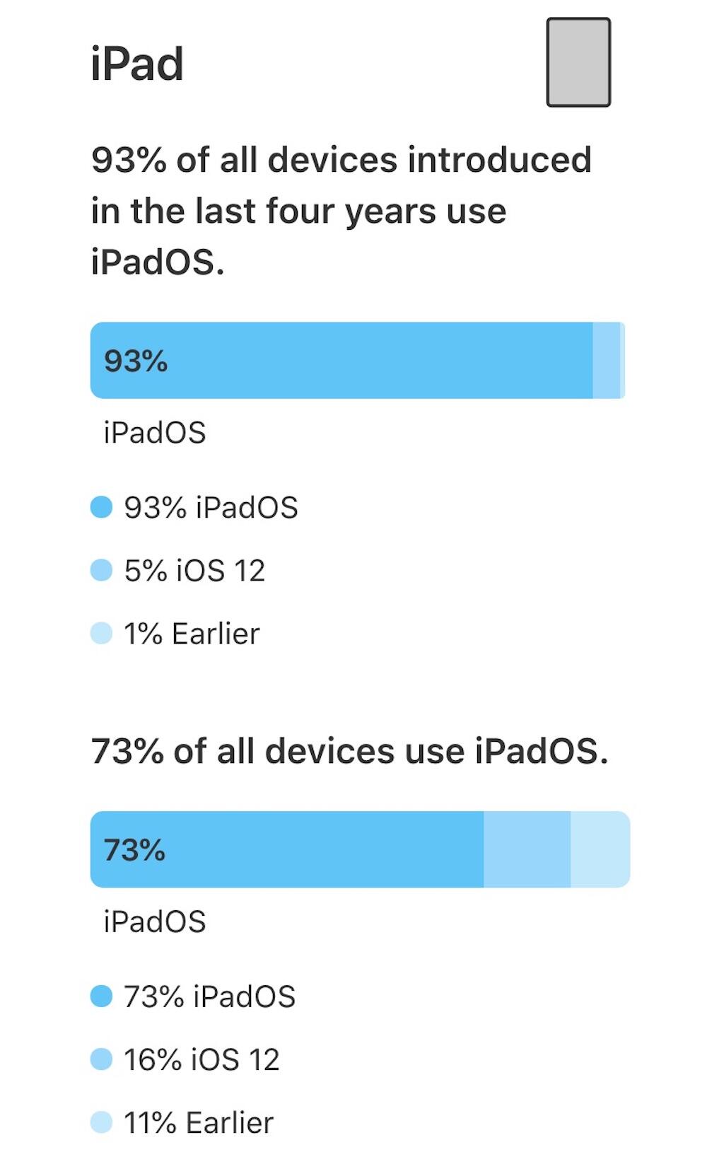 Bei den Zahlen trennt Apple nun auch iOS und iPadOS und bei den aktuellen Modellen der letzten vier Jahre sieht es ähnlich aus. Nur beim Blick auf den gesamten Anteil wird deutlich, dass iPad-Nutzer entweder nicht so oft ihr iPad aktualisieren, oder noch viele ältere Modelle im Umlauf sind.