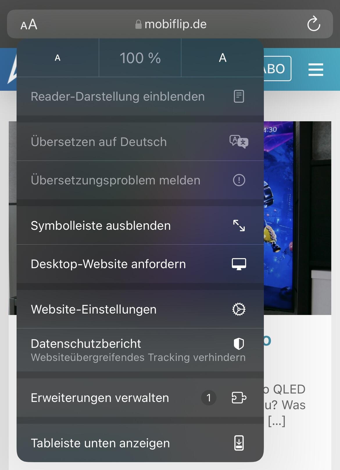 Es geht aber auch schneller, und zwar direkt in Safari. Klickt dazu einfach auf „aA“ in der Adressleiste und wählt „Tableiste oben anzeigen“ aus. Es gibt diese Option natürlich auch umgekehrt („Tableiste unten anzeigen“), wenn sie schon oben ist.