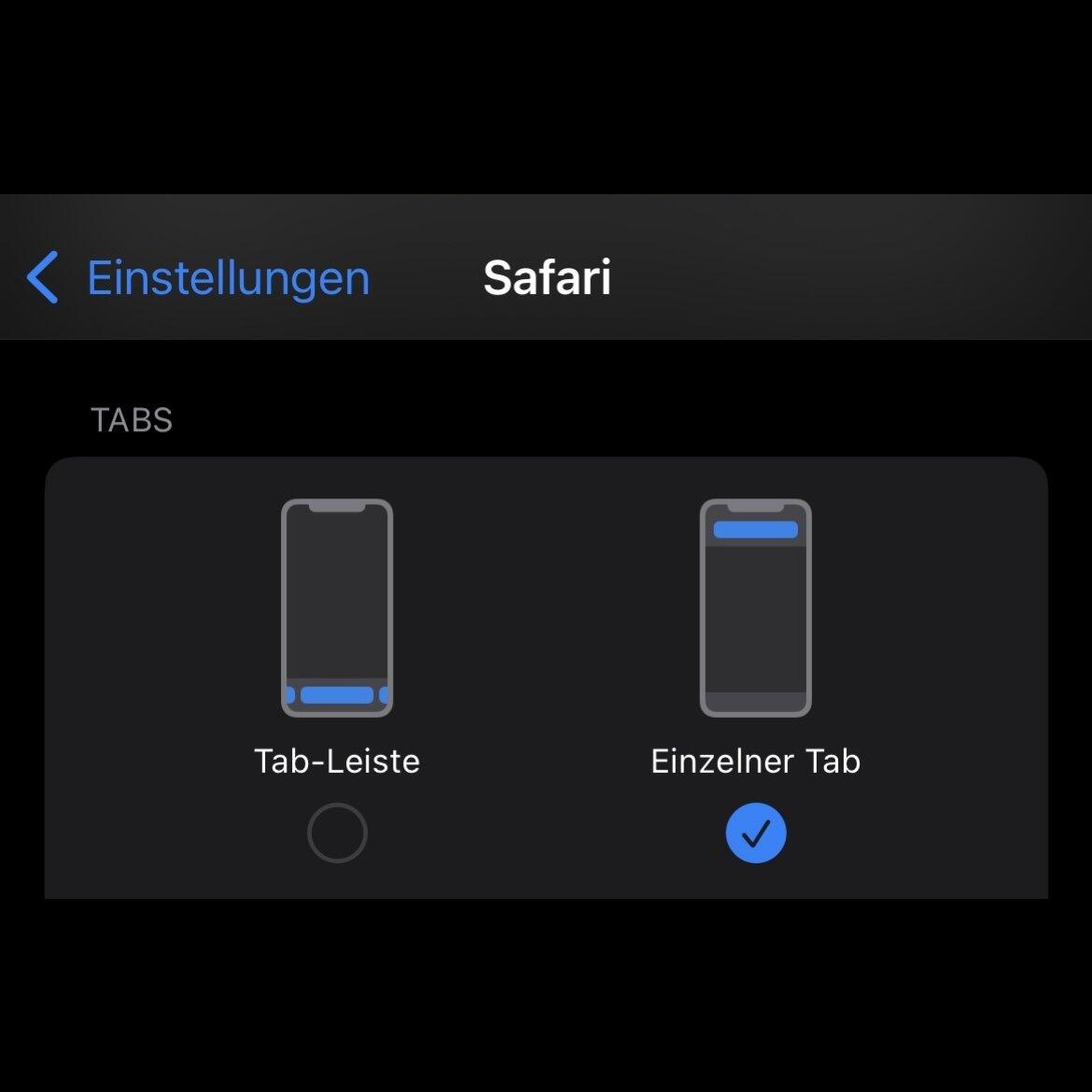 Wie packt ihr die Adressleiste also wieder nach oben? Eine Option ist ein Blick in die Einstellungen, dort geht ihr auf Safari, scrollt hier ein bisschen runter und könnt dann „Tabs“ sehen. Hier zeigt euch eine Grafik schon die zwei Optionen an: