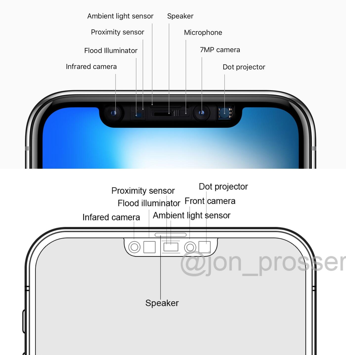 Jon Prosser hat heute ein neues Bild veröffentlicht, welches die neue Notch auf einer Skizze zeigen soll. Demnach würde Apple vor allem durch eine neue Position für den Lautsprecher eine kleinere Notch ermöglichen, denn die restlichen Sensoren für Face ID sind weiterhin ganz normal in der Notch vorhanden.