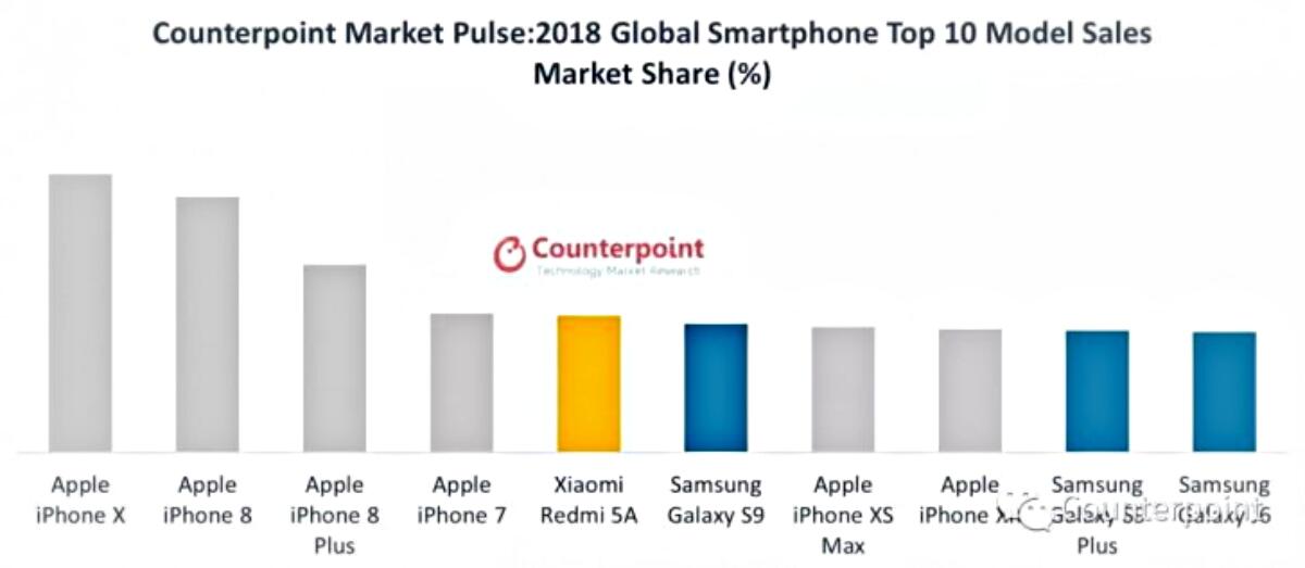 Laut Counterpoint dominiert Apple diesen Markt und die Modelle von Ende 2017 belegen die ersten drei Plätze. Das iPhone X war laut einer Counterpoint-Analyse das erfolgreichste Smartphone 2018. Im Prinzip wird diese Liste mit Modellen von Apple und Samsung belegt, es gibt aber eine Ausnahme: Das Xiaomi Redmi 5A.