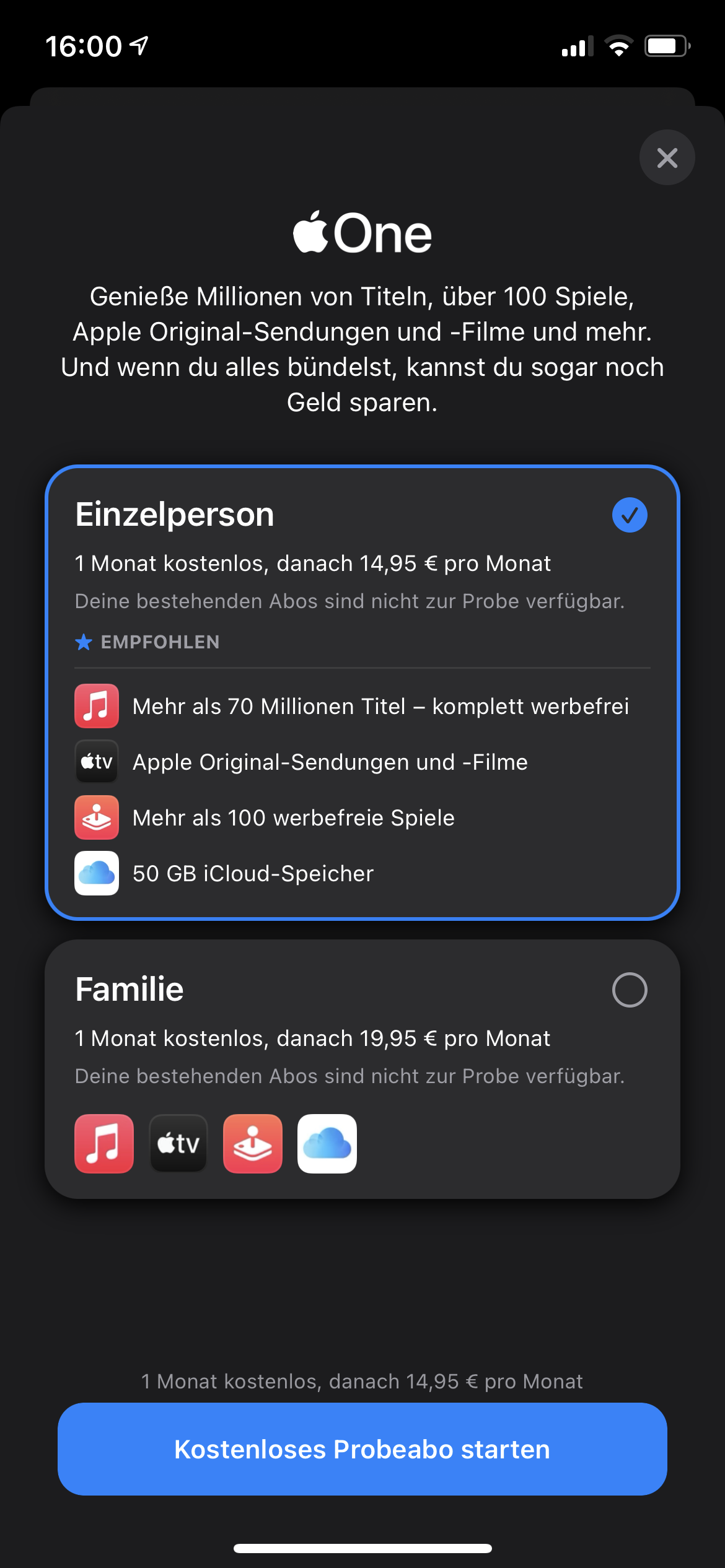 Solltet ihr einen der Dienste noch nicht getestet haben, dann könnt ihr diesen wie immer einen Monat kostenlos nutzen. Sollte Apple One für euch interessant sein, dann geht in den App Store, klickt oben auf euer Profilbild und dann dort weiter auf „Abonnements“ – bei mir ist dort ab sofort Apple One zu sehen.