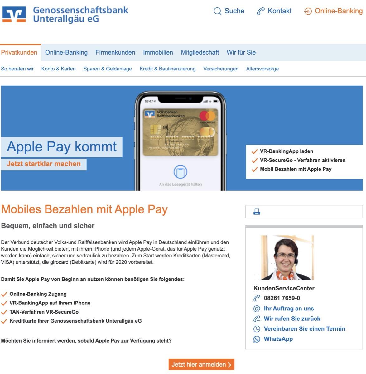 Der Verbund deutscher Volks-und Raiffeisenbanken wird Apple Pay in Deutschland einführen und den Kunden die Möglichkeit bieten, mit ihrem iPhone (und jedem Apple-Gerät, das für Apple Pay genutzt werden kann) einfach, sicher und vertraulich zu bezahlen. Zum Start werden Kreditkarten (Mastercard, VISA) unterstützt, die girocard (Debitkarte) wird für 2020 vorbereitet.