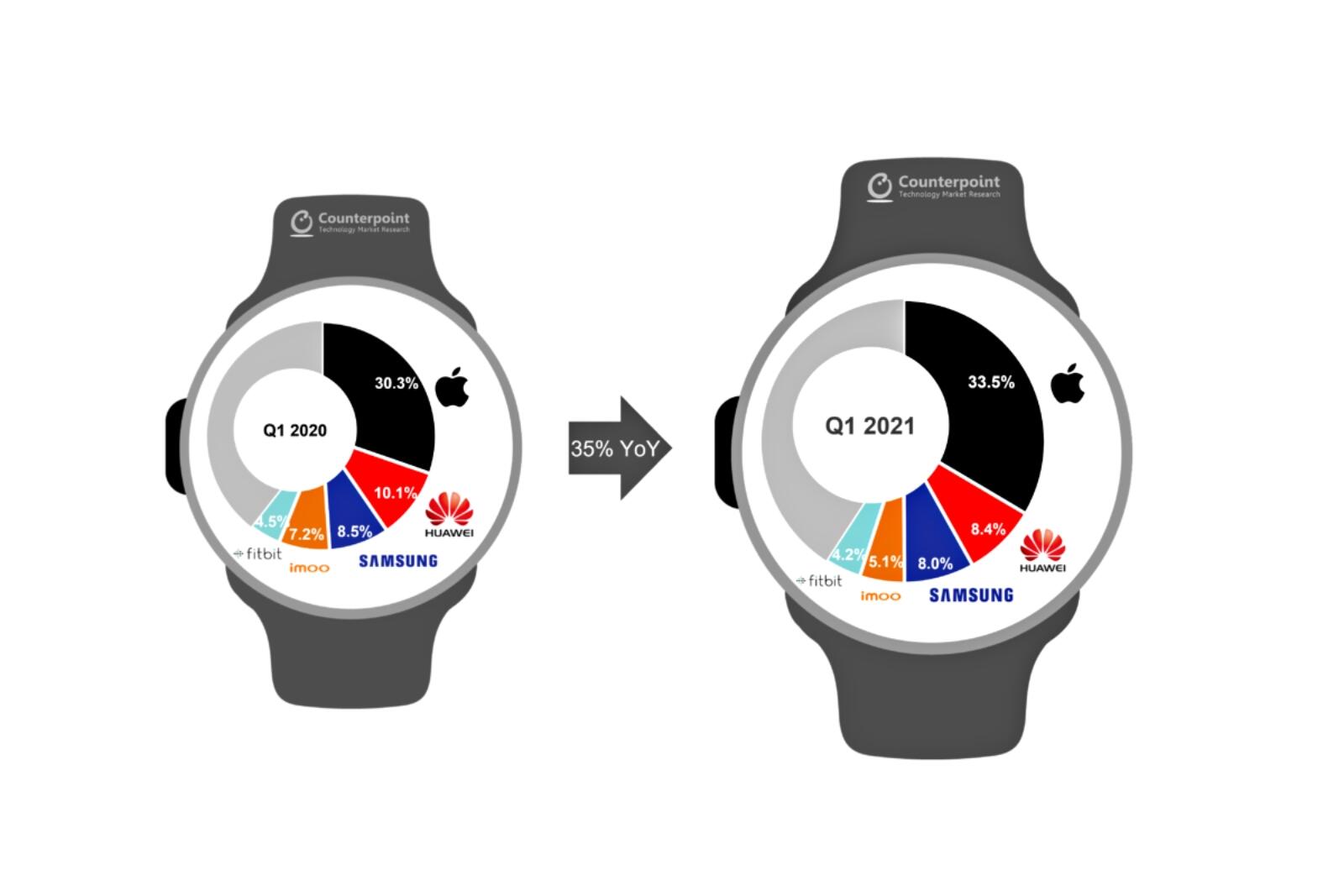 Hier hat sich im Vergleich zu 2020 nichts getan: Apple bleibt Marktführer. Laut der Analyse von Counterpoint Research konnte man im ersten Quartal wachsen und den Marktanteil ausbauen – obwohl der Smartwatch-Markt allgemein zulegte.