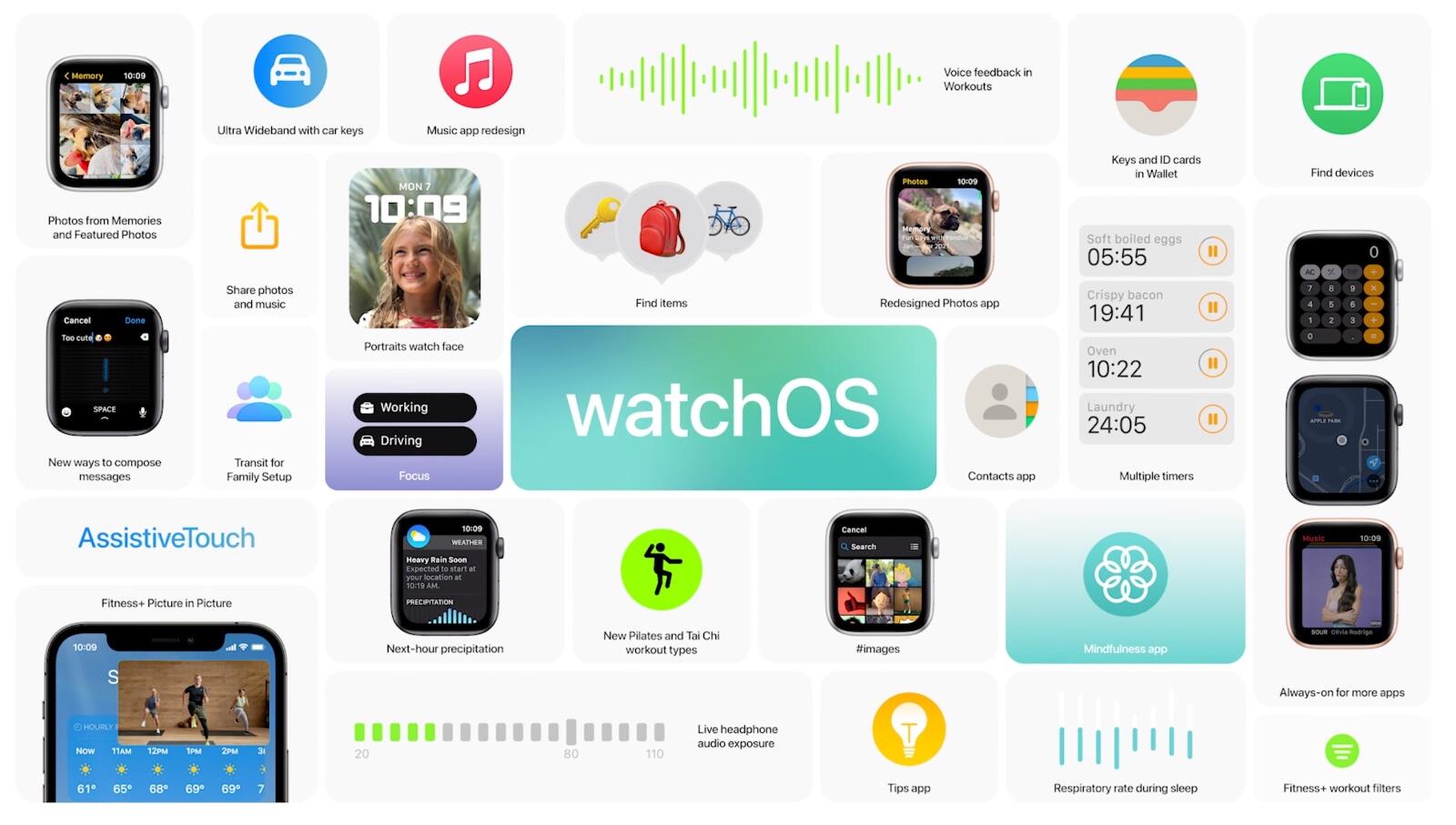Was ist neu bei watchOS 8? Es gibt eine neue Mindfulness-App (in die nun die Breathe-App integriert ist), zwei neue Workout-Modi (Tai-Chi und Pilates), ein neues Watchface (Porträtfotos) und GIFs als Antwort-Option für Nachrichten.
