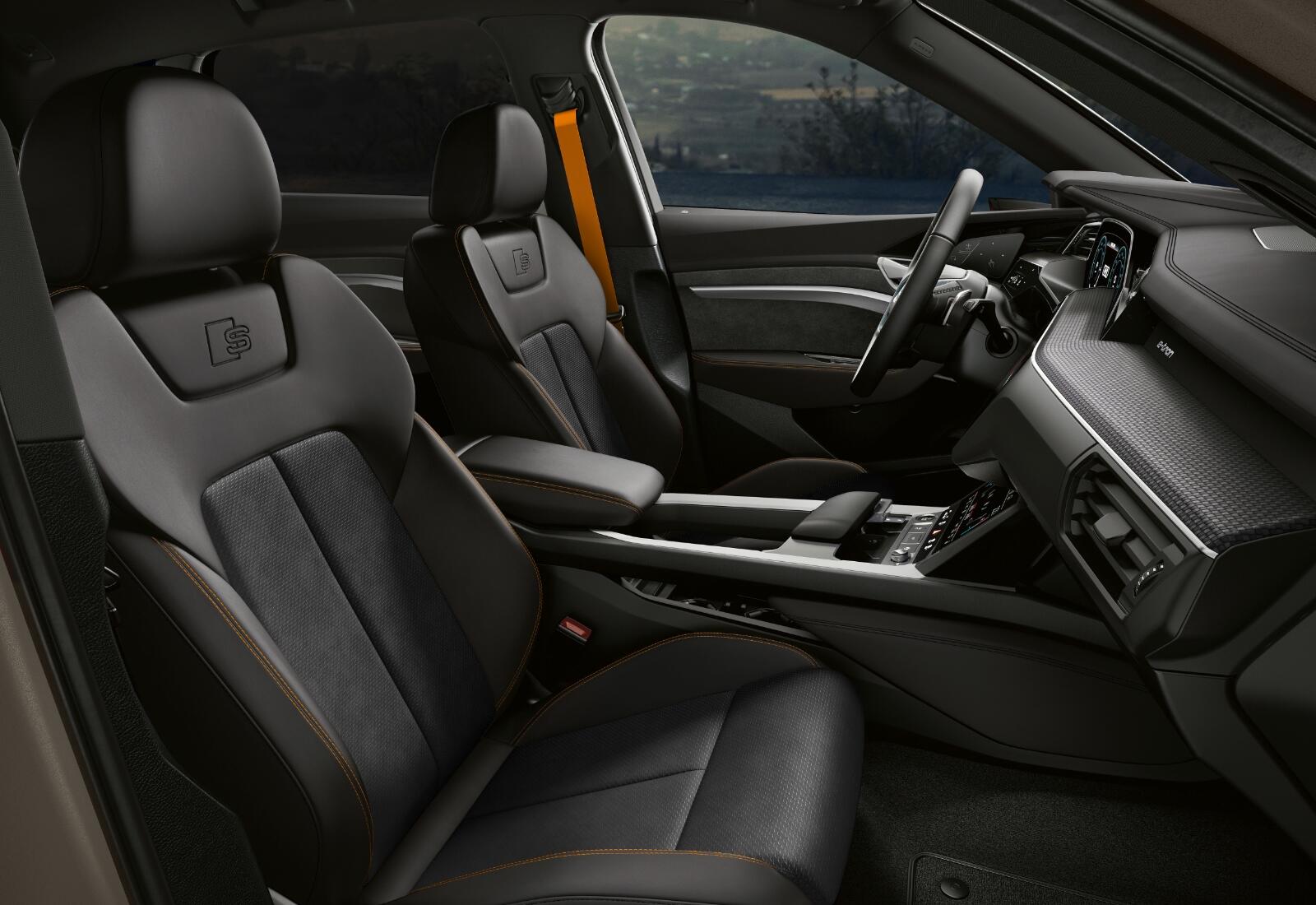 - Sitzbezüge in Mikrofaser Dinamica** Frequenz/Leder-Kombination, schwarz mit Kontrastnähten in Dynamikorange sowie S-Prägung in den Lehnen der Vordersitze