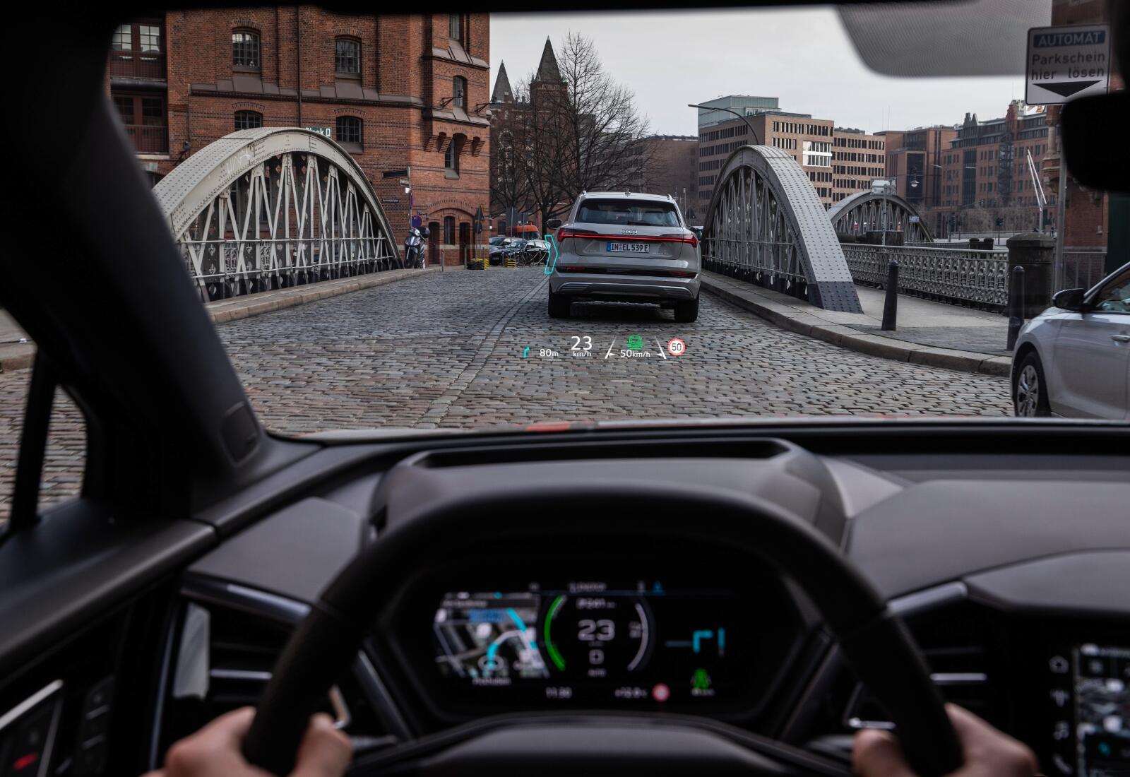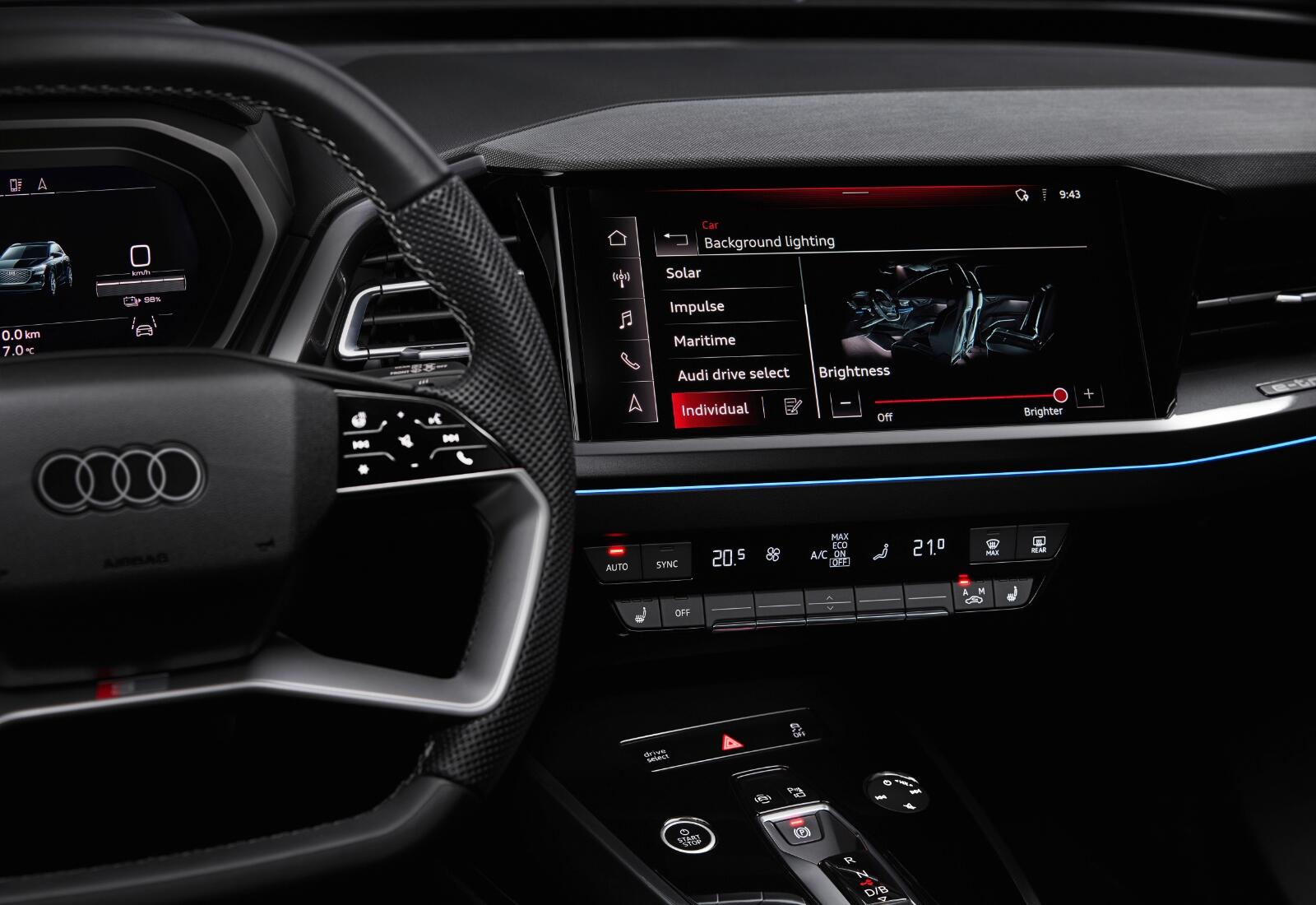 Hinter dem Lenkrad findet man ein weiteres Display, welches wichtige Daten rund um das Auto anzeigt, zum Beispiel die restliche Reichweite. Gesteuert wird nicht nur über Touch, sondern auch über die Sprache mit einem „Hey Audi“.