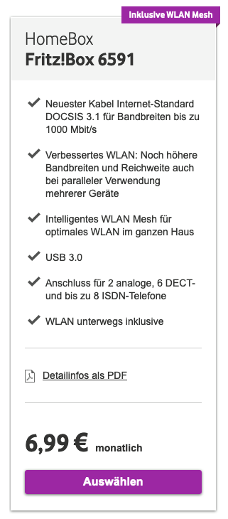 Die Kosten für die Box liegen bei 6,99 Euro pro Monat. Im Grunde ist die FRITZ!Box 6591 bei Vodafone nicht neu, aber in den letzten Monaten war die Box nicht lieferbar, was sich nun geändert hat.
