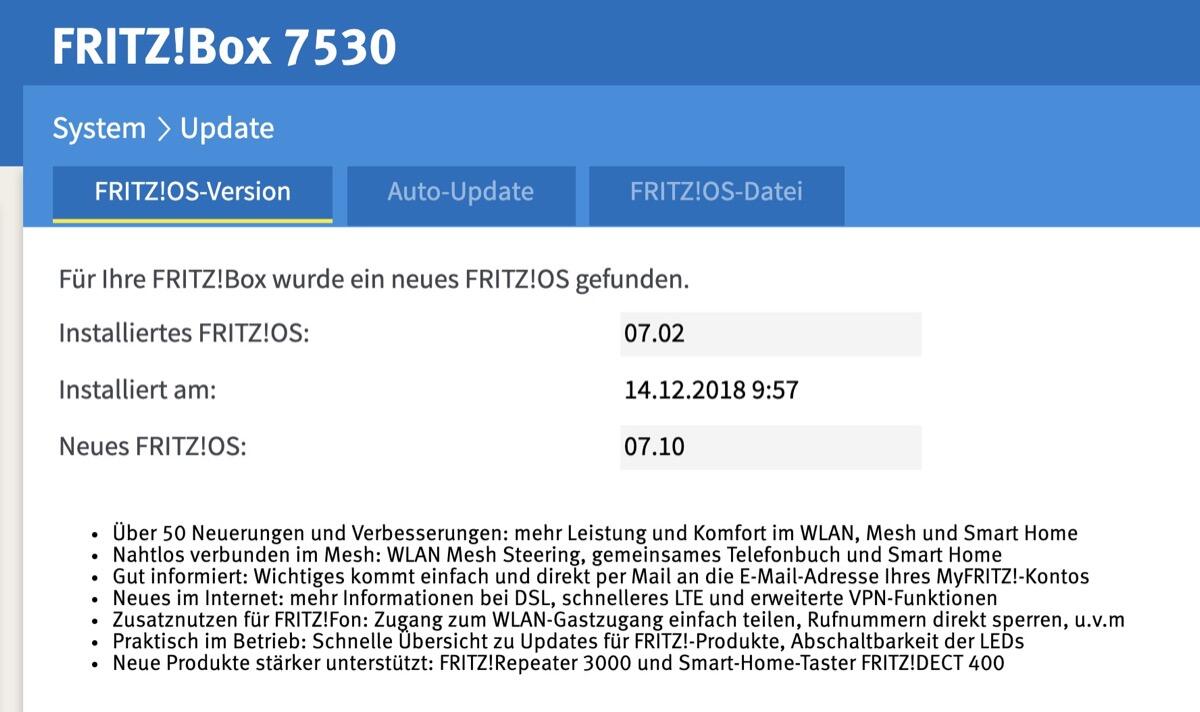 Das Update für die FRITZ!Box 7530 und FRITZ!Box 7520 sollte euch ab heute direkt über die FRITZ!Box-Oberfläche angeboten werden.
