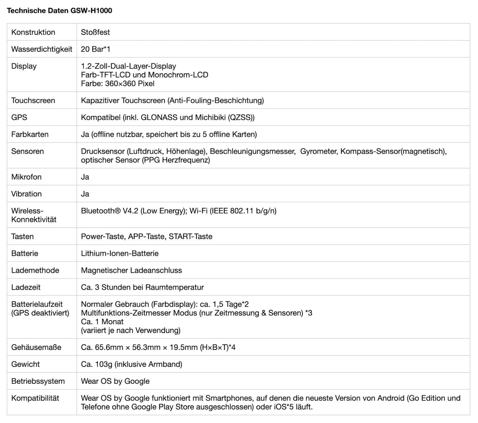 G-Shock mit Wear OS: Spezifikationen