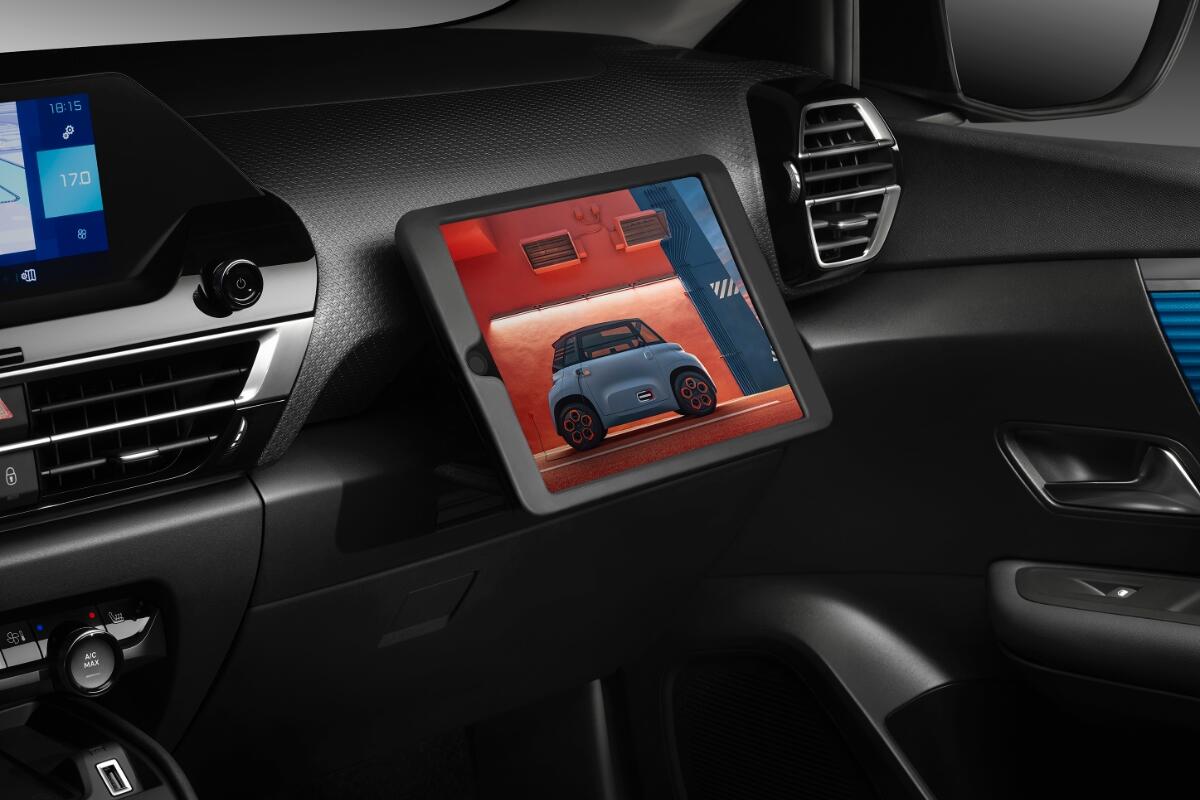 Interessante Weltneuheit beim Citroën ë-C4: Es gibt eine Tablet-Halterung für den Beifahrer, die mit dem Apple iPad Air oder Samsung Galaxy Tab mit 10,5 Zoll kompatibel ist. Alternativ gibt es auch Halterungen für andere Tablets.