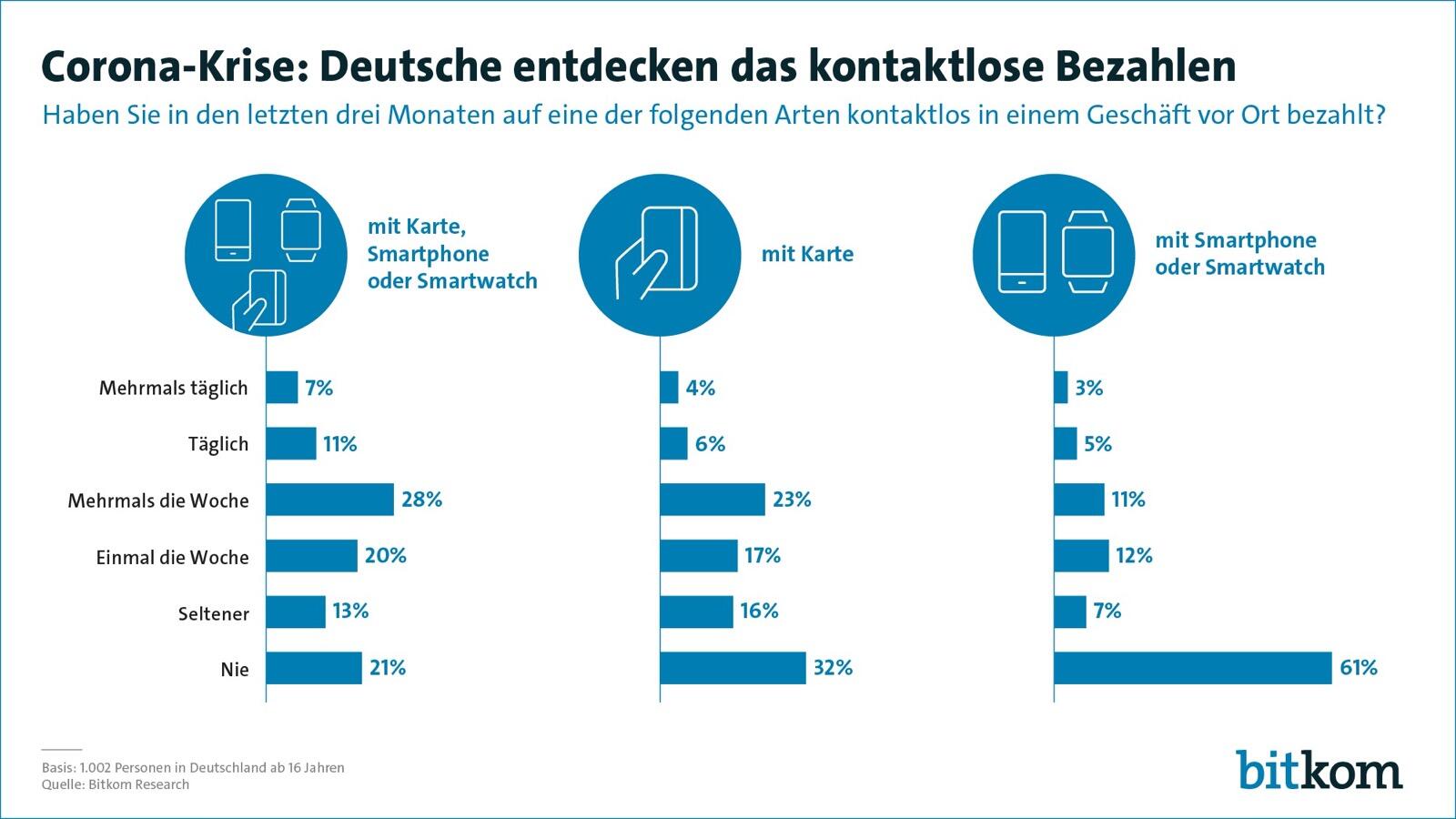 Mehr als drei Viertel (79 Prozent) der Bundesbürger geben an, in den drei Monaten von September bis November bis zum jüngsten Lockdown mit der Schließung der meisten Geschäfte mindestens einmal kontaktlos mit Karte, Smartphone oder Smartwatch bezahlt zu haben. Dabei nutzen 7 Prozent die Möglichkeit mehrmals täglich, 11 Prozent zumindest einmal am Tag, 28 Prozent mehrmals pro Woche und weitere 20 Prozent zumindest einmal pro Woche.