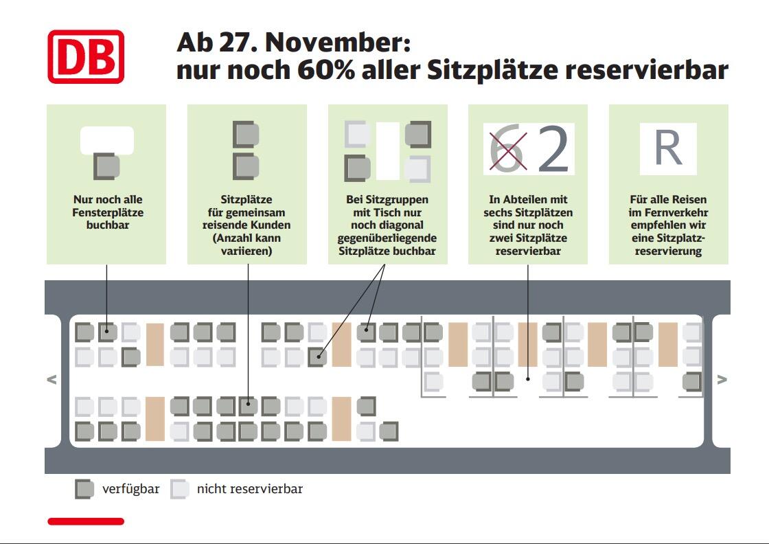 Reservierungen von Einzelreisenden auf nebeneinander liegenden Sitzplätzen sollen so vermieden werden. In geschlossenen Abteilen mit sechs Sitzplätzen sind nur noch zwei Plätze reservierbar, der Fensterplatz auf der einen und der Gangplatz auf der anderen Seite. Insgesamt bietet die DB nur noch 60 Prozent der Sitzplätze zur Reservierung an.