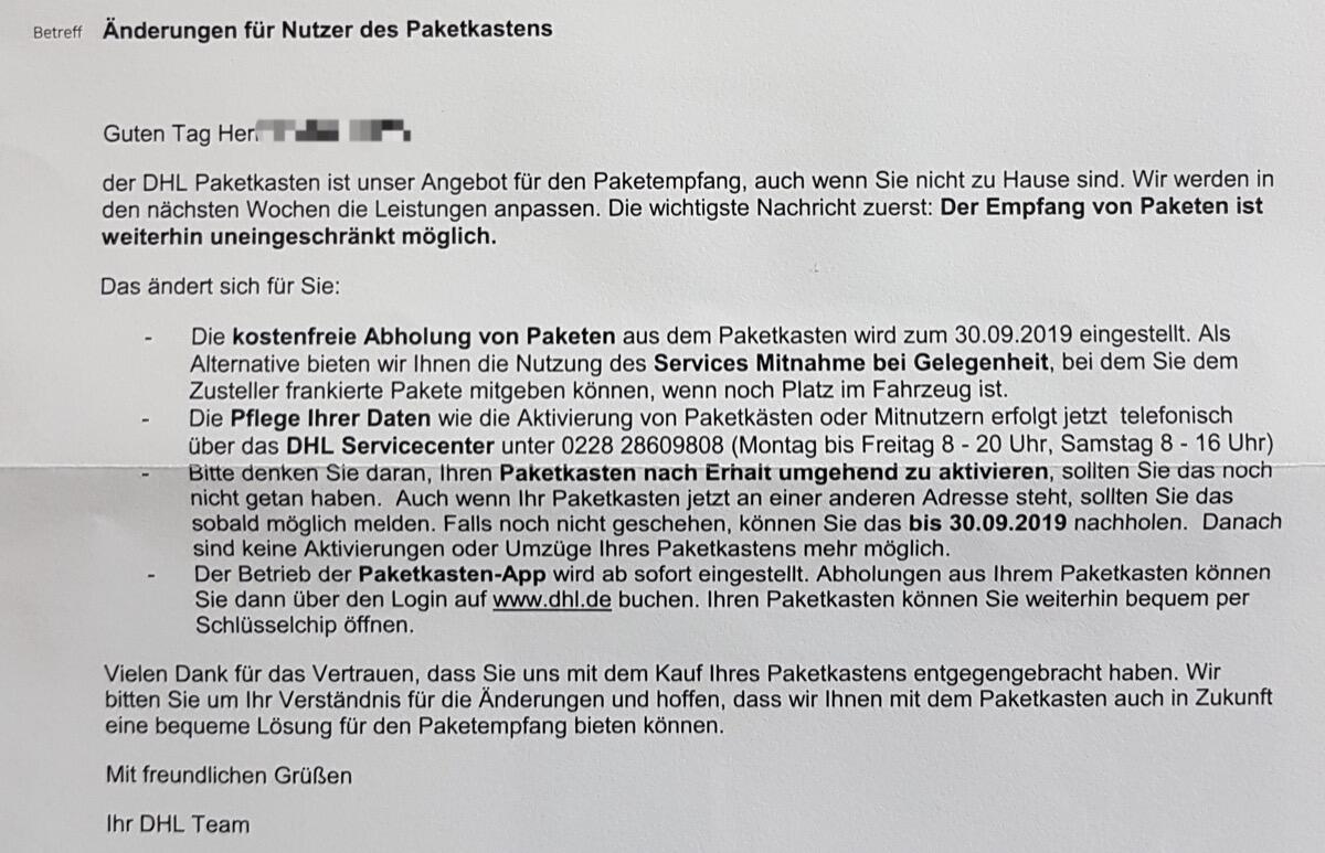 DHL informiert aktuell die Nutzer des DHL Paketkastens per Anschreiben über erhebliche Einschränkungen des Services.