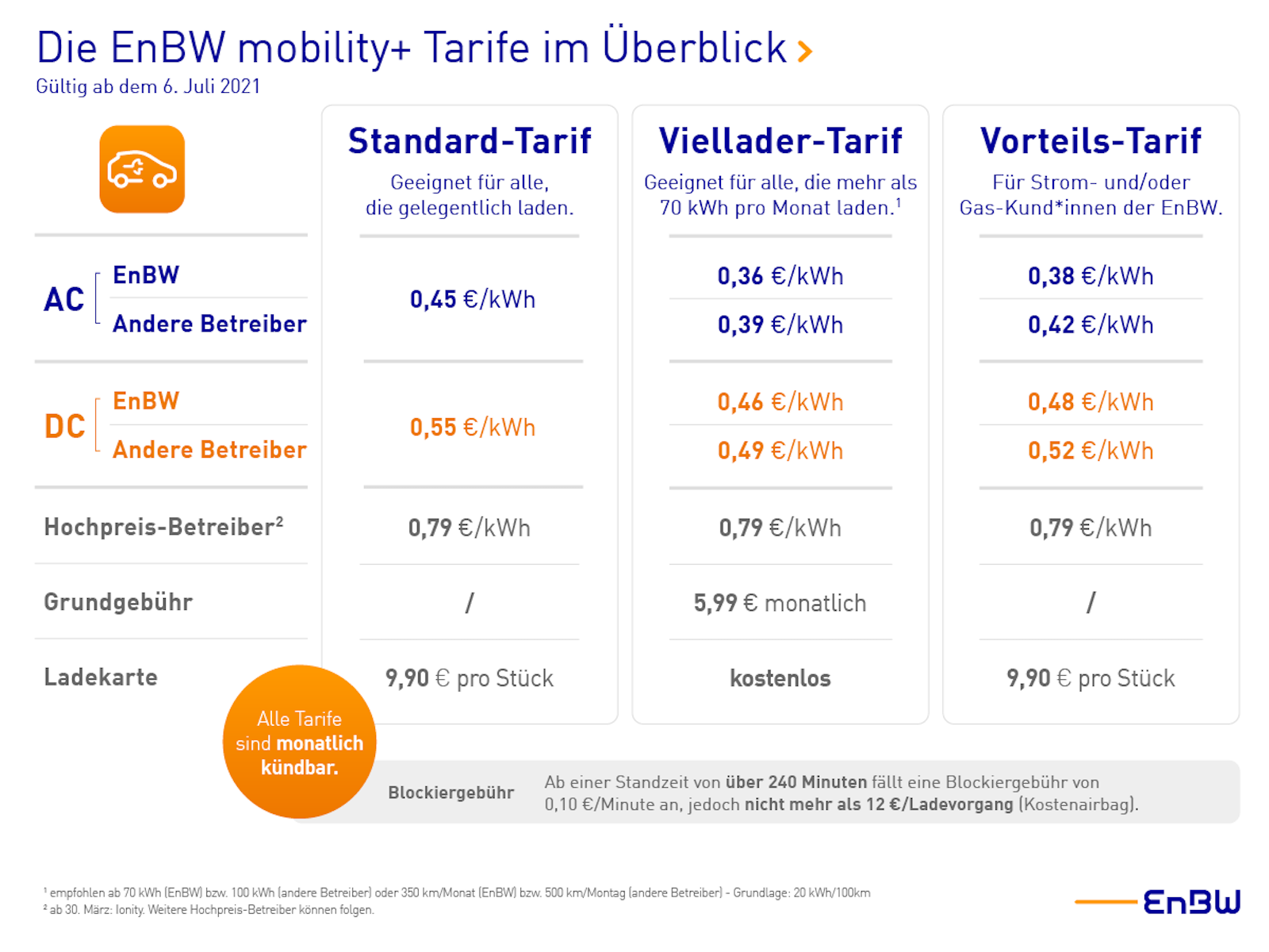 Daher gibt es ab dem 6. Juli neue Tarife bei EnBW. Das AC-Laden kostet im neuen Standard-Tarif, der kein kostenpflichtiges Abo benötigt, bald 45 Cent pro kWh und DC-Laden wird dann 55 Cent kosten (bisher: 38 ct/kWh und 48 ct/kWh).