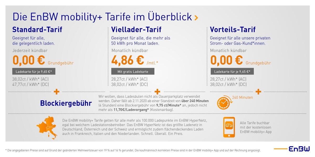 Alle bekannten Kilowattstundenpreise für das Laden an Normal- oder Schnellladestationen sowie die Preise für (zusätzliche) EnBW mobility+ Ladekarten und die Grundgebühr im EnBW mobility+ Viellader-Tarif bleiben unverändert.