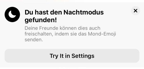 Um diesen zu aktivieren, muss in einem Chat das Mondsichel-Emoji ? gesendet werden. Anschließend sollte ein Hinweis sowie eine neue Option für den Dark Mode in den Einstellungen der App auftauchen. Sollte dies nicht der Fall sein, könnt ihr noch versuchen mal doppelt auf das Mond-Emoji zu tippen.