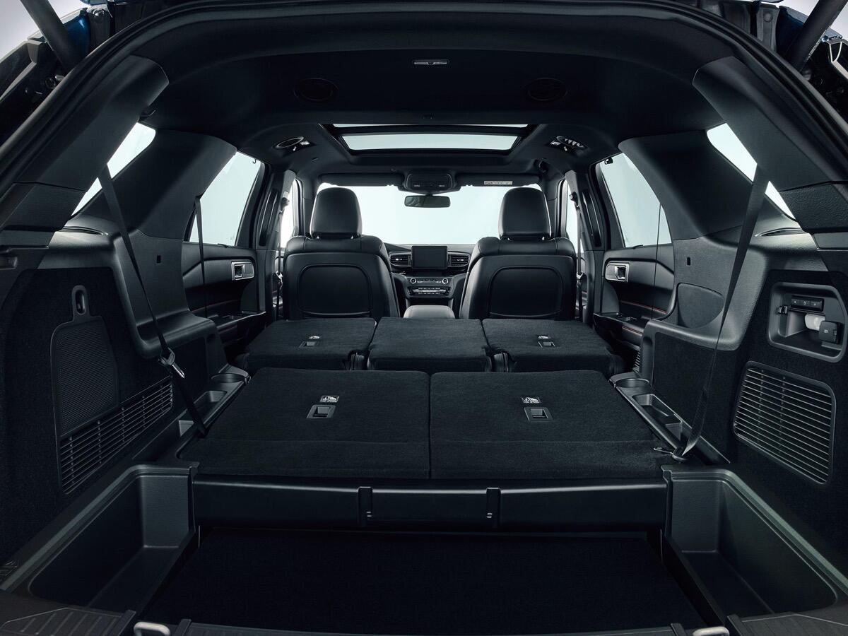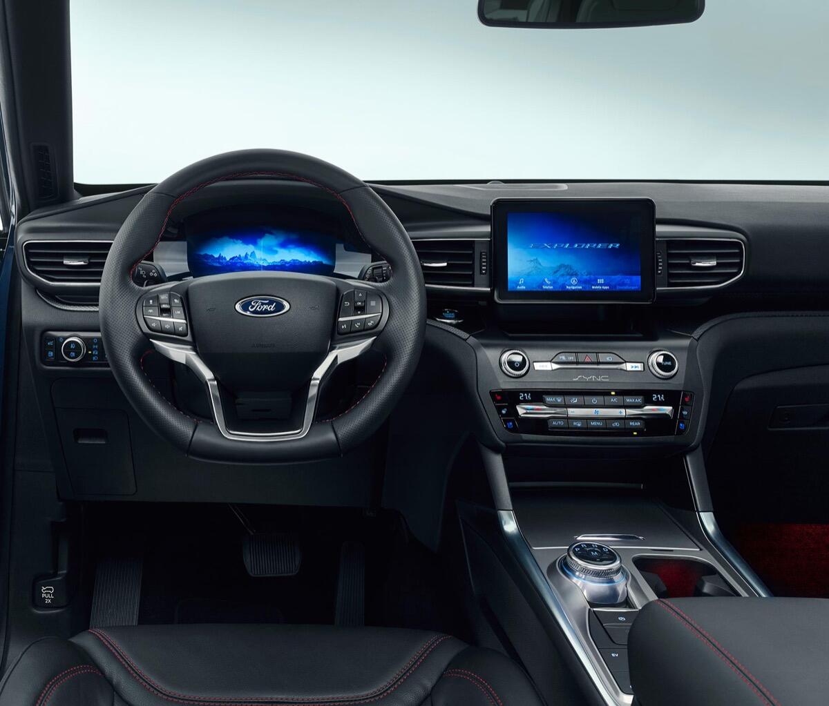 Zum Explorer-Lieferumfang ab Werk gehören unter anderem die aktive Geräuschkompensation, die Zweizonen-Klimaautomatik, die Premium-Lederpolsterung in Schwarz mit perforierter Sitzmittelbahn sowie das beheizbare und unten abgeflachte Lederlenkrad im ST-Line-Design mit Schaltwippen.