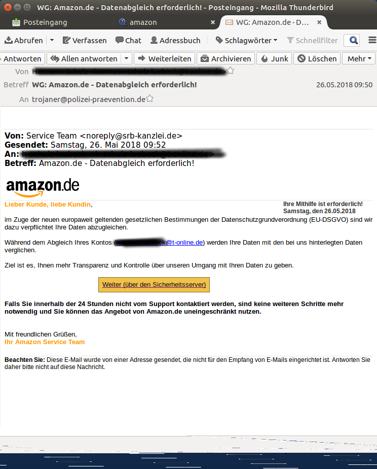 Die Polizei Niedersachsen informiert aktuell darüber, dass gefälschte Amazon DSGVO E-Mails im Umlauf sind. Es gab bereits Personen, die auf diese E-Mails hereingefallen sind. So heißt es: